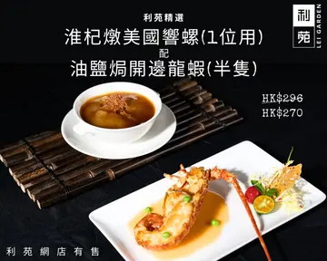 利苑酒家提供大量套餐于食客选择。当中有鲍鱼、响螺、燕窝等贵价食物。利苑酒家着重不断创新以迎合客人的需求及时代的转变,一方面要保持现有菜式的水准并按客人反应加以改良,另一方面更要求每一位厨师钻研新菜,三十年来创出上千款菜式。