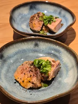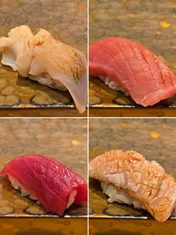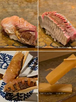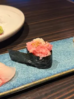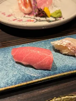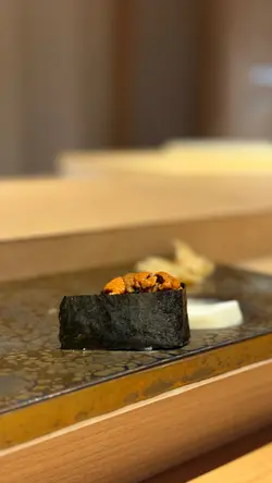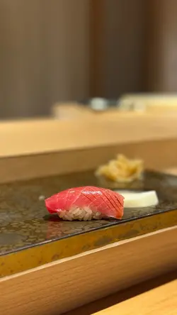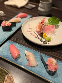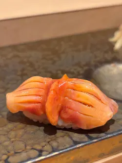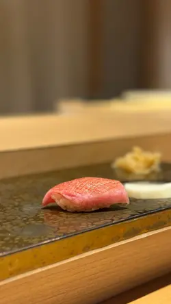 水沙津以熊本阿苏名水调制,搭配新鲜莫札特野菜,入口清甜爽脆,卖相清新,为餐单开启轻盈序幕。刺身三种包括赤身、甜虾及真名鲣,鱼肉鲜嫩,甜虾甘甜,搭配酱油及山葵,味道纯粹。寿司五贯选用三文鱼子、海胆等食材,米饭软硬适中,海产新鲜,展现日式料理的细腻。.