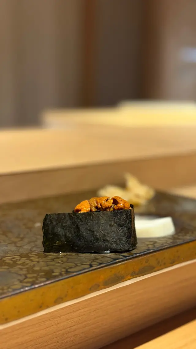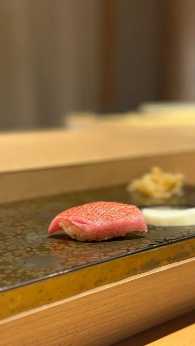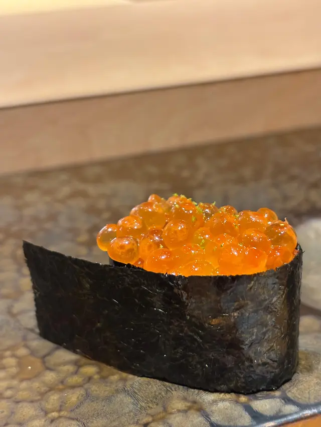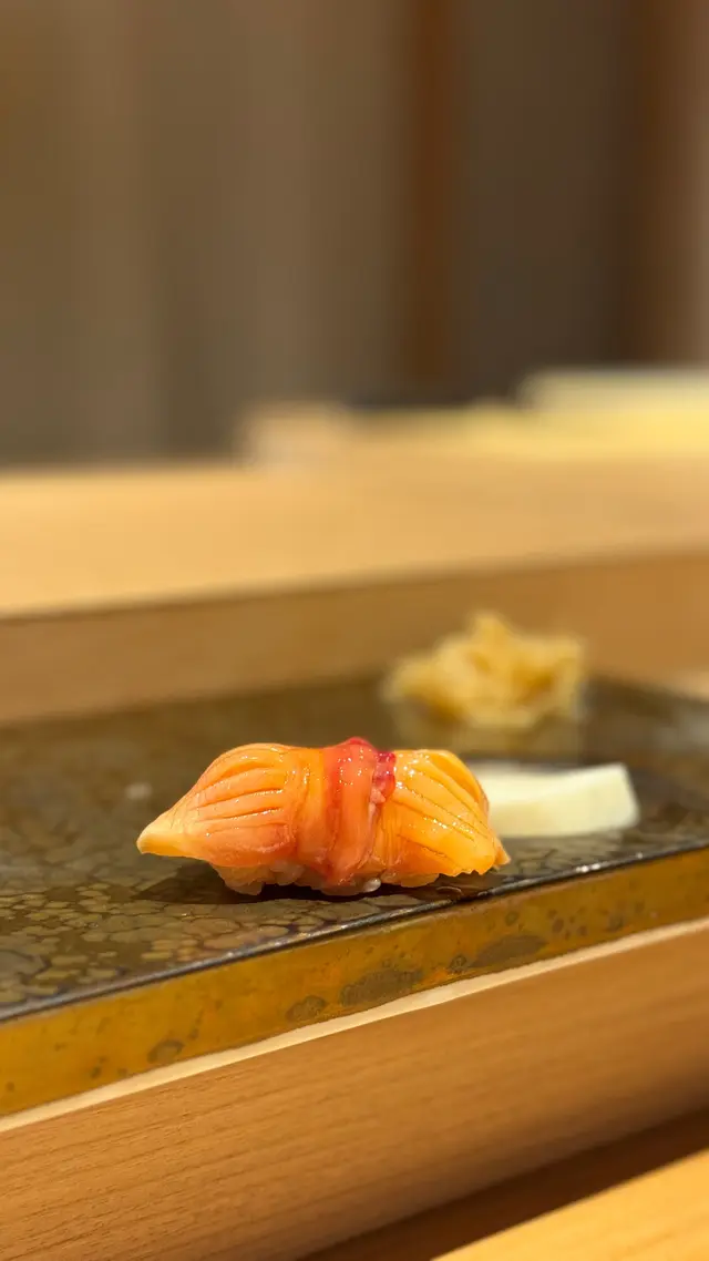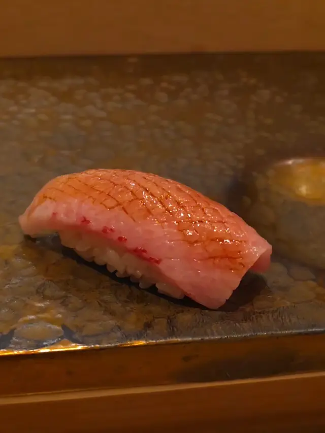 水沙津以熊本阿蘇名水調製,搭配新鮮莫札特野菜,入口清甜爽脆,賣相清新,為餐單開啟輕盈序幕。刺身三種包括赤身、甜蝦及真名鰹,魚肉鮮嫩,甜蝦甘甜,搭配醬油及山葵,味道純粹。壽司五貫選用三文魚子、海膽等食材,米飯軟硬適中,海產新鮮,展現日式料理的細膩。.