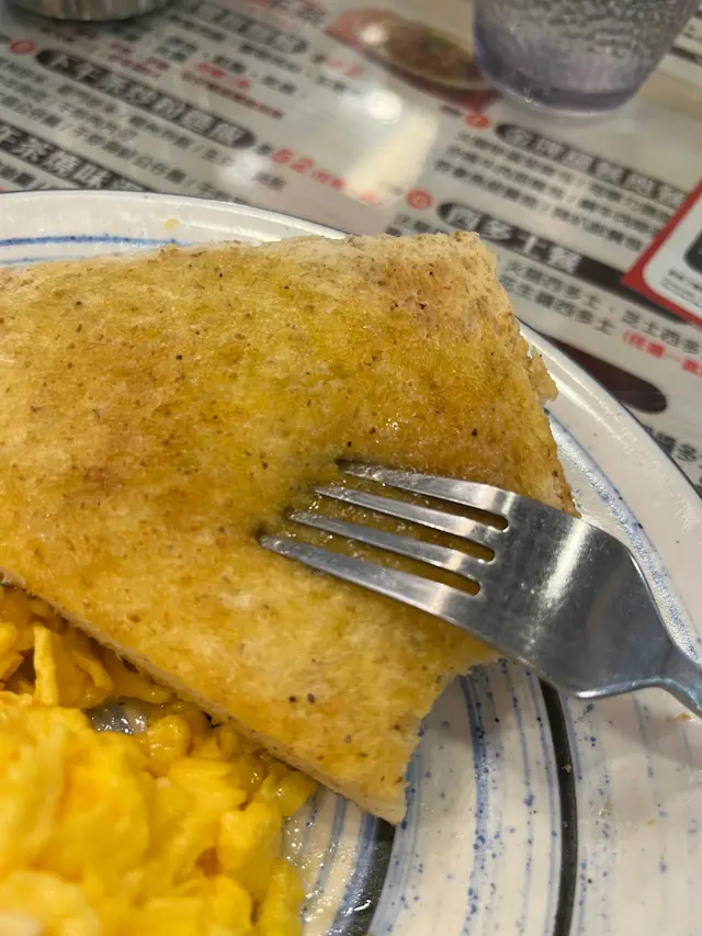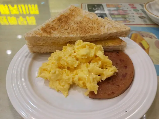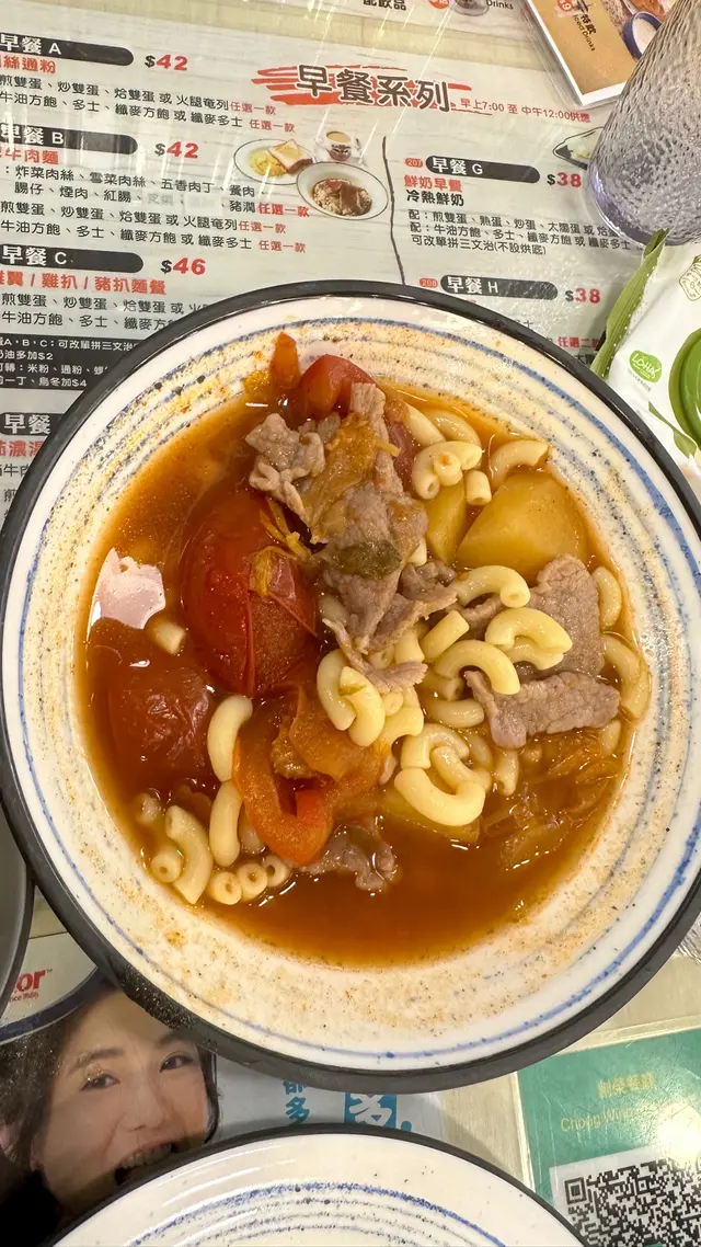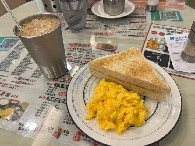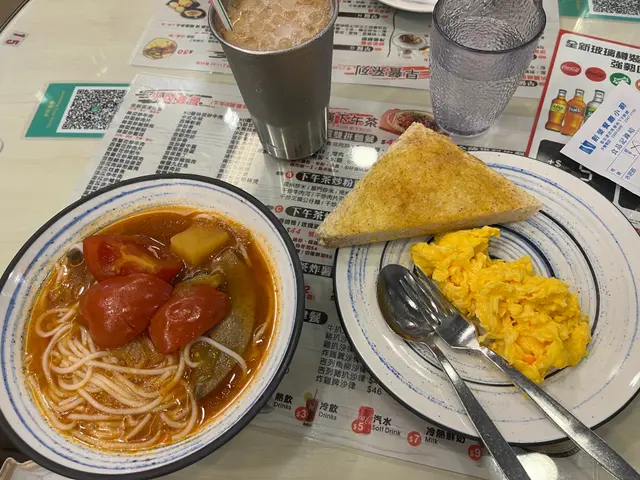 由於呢日起附近做嘢,於是望都唔望個餐牌,走入呢間從未幫襯過嘅屋邨商場茶餐廳幫襯,心諗屋邨商場茶餐廳有幾貴呀?入到去坐低,早餐只得一塊卡板,前後兩邊,由於我對豬膶情有獨鍾,所以揀咗個貴啲嘅餐:鮮茄豬膶,配上茶記少見嘅螺絲粉,麵包亦揀咗少見嘅纖麥多士,餐肉及炒蛋,熱奶茶。點評如下:奶茶瓦杯上,但凡呢種杯上,品質都唔會差得去邊,呢次都唔例外;纖麥多士,即係麥方包,搽上糖漿,味道唔錯;半塊圓罐正常厚度嘅火腿午餐肉,呢間茶記話係用天龍牌(見餐牌),呢個牌子嘅火腿午餐肉,質素信得過,唔會過鹹;炒蛋,碎濕濕,從餐牌另外嘅餐顯示係用北海道牛乳去炒,但我食唔到牛乳嘅味道,同大家樂或者一粥麵嚟比,完全無得比,兩家嘅炒蛋完整一塊,不單只滑,而且有牛油嘅香味;豬膶同牛肉一樣,切忌過熟,一定要軟身先至好食,而呢間嘅豬膶雖然厚度夠,但過熟,完全唔好食,加上無薑絲醃過去腥,味道就更差;蕃茄同薯仔一樣,可以切細啲,會更易入口;呢個湯唔係純蕃茄湯,而係蕃茄雜菜湯,裡面有其他菜蔬,味道未見突出,但還可以。一個咁嘅早餐要$47,我相信莫講話同區,即使同一商場內,同一價錢,應該有更好選擇。…查看更多