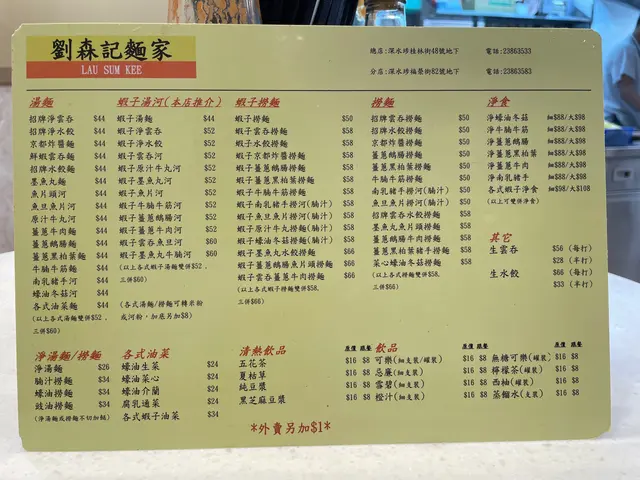 劉森記麵家 (桂林街) (深水埗) 网址: https://s.openrice.com/QrLS0hYW000 地址: 香港深水埗桂林街48號地舖 电话: +852 23863533
