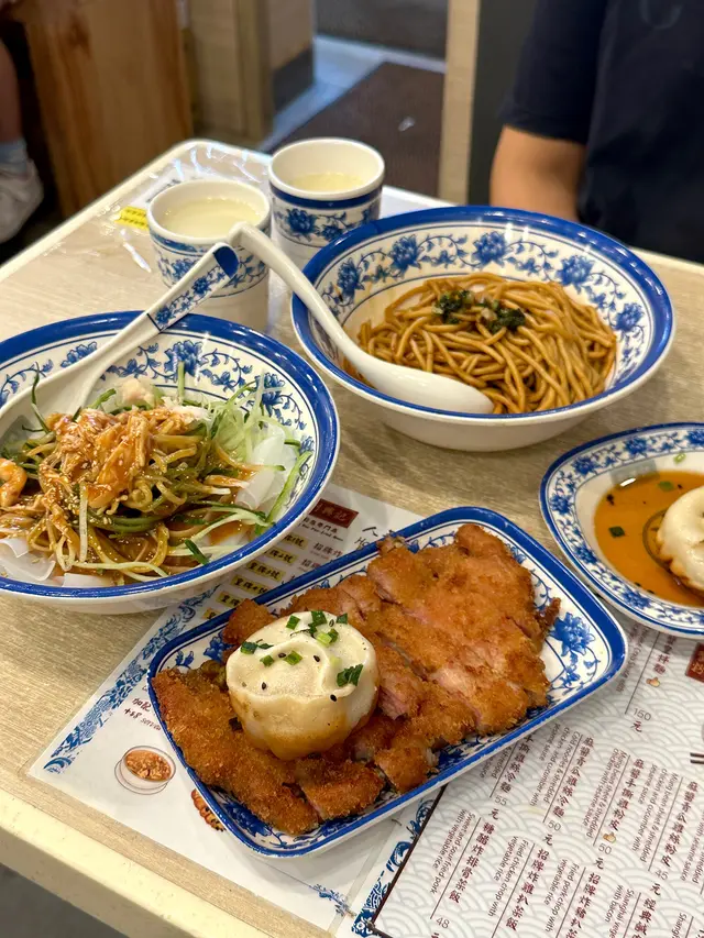 一時多,在猛烈太陽底下,站着排隊等位,幸好不算太久,十多分鐘就輪到我們了。店舖不大,都是拼桌,吃完就走。掃二維嗎點餐,瀨尿蝦已售罄,小籠包亦是。點了蟹黄生煎包(兩隻)招牌生煎包(兩隻)招牌炸豬排菜飯+生煎包(\隻)配凍豆漿。太多人叫生煎包,催促許久仍在煎中,豆漿也是叫了幾次才送上。不久,豬排菜飯到了,但送的生煎包就沒有來,到最後,還忘記了,催促了N次才補上,但就暖和的