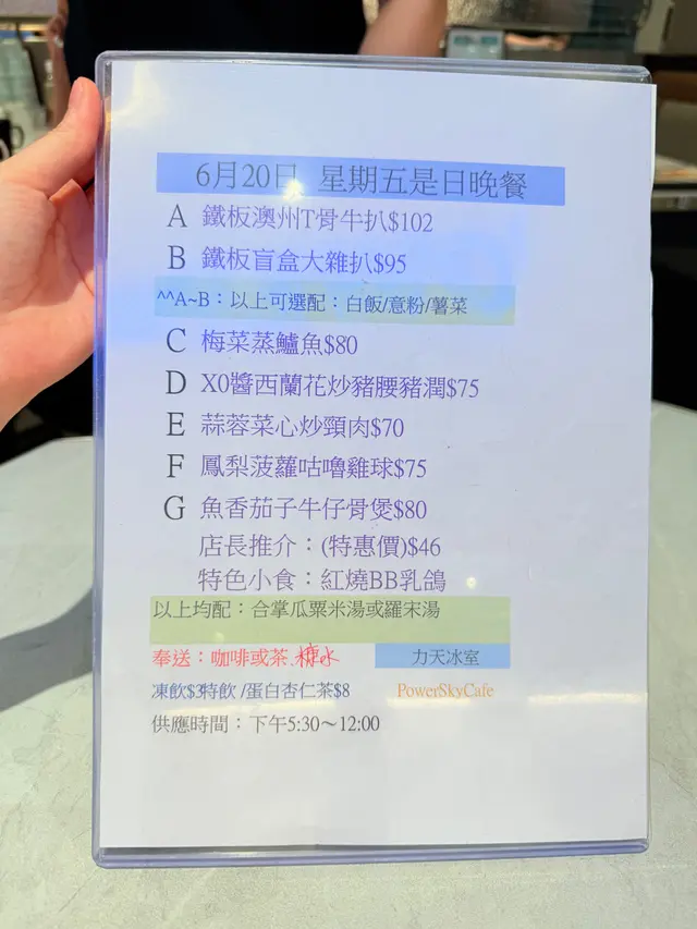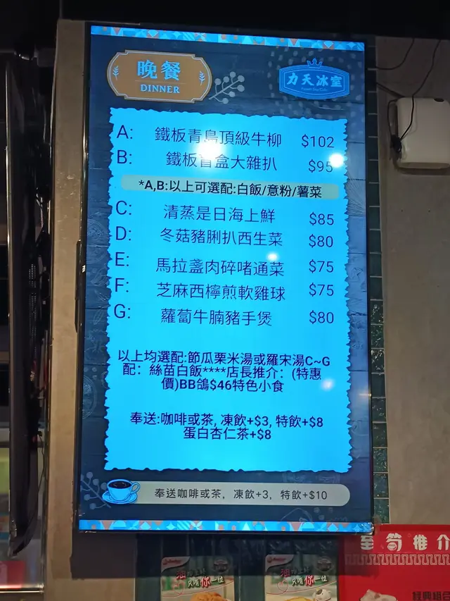 同朋友搵地方食晚飯,之前就有同事話新蒲崗「力天冰室」晚市鋸扒世一,初時以為咁誇張,所以就過去試試!🥩 鐵板澳洲牛肉眼扒配薯菜蒜蓉汁(五成熟)😎 牛肉一上枱熱辣辣,滋滋聲好吸引!🥳 牛肉超腍嫩,切開粉紅多汁,肉味好濃,入口滿滿牛香,完全唔柴!蒜蓉汁香濃得來唔搶味,襯托牛肉嘅鮮味好正!😍 薯菜份量超多,薯仔煎得外脆內軟,佢俾嘅甘筍同粟米都超多,甘筍爽脆,吸晒蒜蓉汁嘅味道,食落好滿足,呢碟真是一個亮點!🥔🥬🦑 XO醬西蘭花炒鮮魷跟住試咗XO醬西蘭花炒鮮魷,XO醬香氣撲鼻,帶少少辣味,好惹味嗰種!🌶️ 鮮魷好新鮮,切得薄身,炒得爽口彈牙,咬落有陣陣海鮮甜味。西蘭花煮得啱啱好,保持脆口,吸咗XO醬嘅香辣味,食落好開胃!😋 呢道菜調味得宜,辣度唔會過火,啱晒愛食少少辣嘅朋友!🐦 紅燒BB乳鴿仲點咗紅燒BB乳鴿,燒得外皮金黃,望落好香脆!🐔 鴿肉嫩滑,燒得幾香,鹹味調得啱啱好,入口有濃郁嘅燒烤香氣,唔會太乾。肉質細嫩,骨邊嘅肉仲帶點汁,食落好有滿足感!😜 呢道燒味真是一個驚喜,係茶餐廳少見嘅用心之作!🍹 青檸菠蘿賓治飲品揀咗青檸菠蘿賓治,一上枱見到係成罐七喜配青檸同菠蘿粒,感覺好開心!🥤 飲落酸酸甜甜,青檸嘅清新同菠蘿嘅甜味好夾,七喜嘅氣泡感增添爽口感,夏天飲真是一個字:爽!😎 成罐七喜俾你自己倒,飲完好開心,份量仲好足!…查看更多