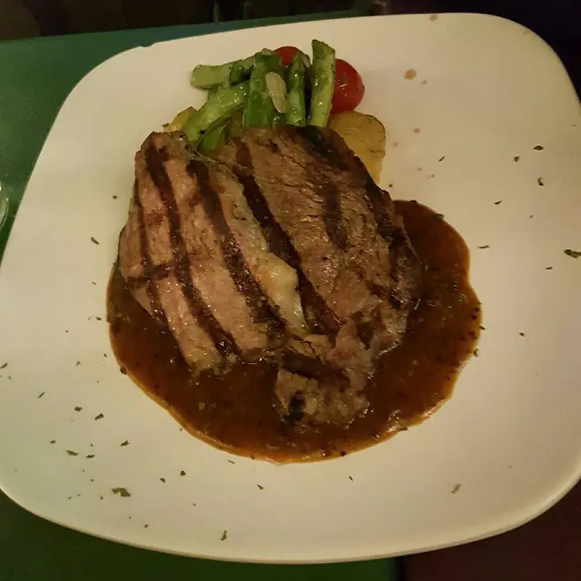 點咗個7成熟肉眼牛扒,見佢有個靚靚格紋,好養眼呀!可惜幾大範圍(大概1/3)都係幾韌,係肉嘅質量問題?!牛可以食到唔算好大範圍,但伴碟有薯仔同豆,都好飽肚!另外,點咗個ribs,估唔到咁大份,足足有8條骨,可以share吓仲要幾厚肉吓,我一個人肯定完全食唔哂~以上兩個主菜嘅伴碟都想講一講,一般都係用水焯熟,但佢應該係油泡過,所以……我扣咗佢分!本身食咁多肉,都想要返伴碟嘅菜/豆/瓜平衡一吓,但佢咁油!完全失咗意義!