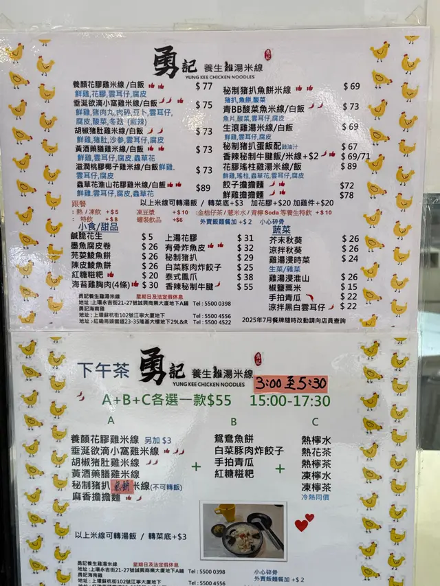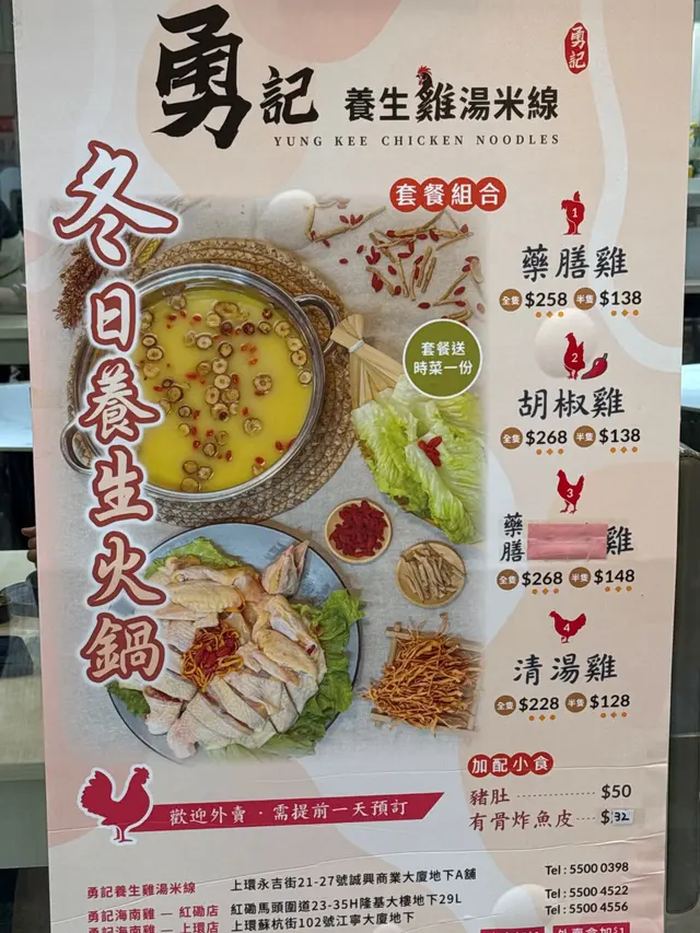 勇記養生雞湯米線 (上环) 网址: https://s.openrice.com/QrLS0ync6W0 地址: 香港上環永吉街21-27號誠興商業大廈地下A號舖 电话: +852 55000398