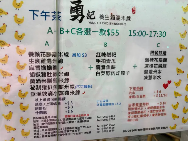 勇記養生雞湯米線 (湾仔) 网址: https://s.openrice.com/QrLS03B8F00 地址: 香港灣仔安樂里1號利昌大廈地下B號舖 电话: +852 55003710