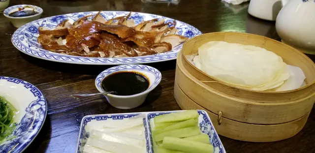 散叫,非套餐。嚟得食京菜,主角当然系只北京填鸭。只鸭上枱时经肢解咗,佢话有一只,我点数都算唔出系一只鸭,不过算。啲皮睇到系干嘅,反转见到啲肉,令我想起已经仙游咗嫲嫲𠮶双干燥嘅脚板底!同鸭一齐上枱仲有配菜青瓜同葱丝,啲青瓜个外貌又系干到都感受到旧青瓜喺三日前被去皮切条,然后遗忘喺冷宫(冷柜先真)。是日仲叫咗酸辣汤、小笼包、鱼皮冷盘、素鹅、上汤津白、荠菜炒年糕、拔丝苹果、高力豆沙,以上除咗酸辣汤、小笼包、年糕同苹果可以外,其他都哗一声咁失望。…查看更多