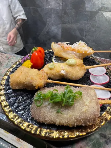 位于九龙城的这家日式串扬专门店,以道地大阪风味为主题,主打刺身与串扬的完美搭配,佐以烧酎怡情,让人恍如置身大阪街头。店内空间虽不大,但布满大阪街景墙纸,搭配整洁高脚吧台座位,营造出浓浓的东瀛氛围。还有厨艺超高、亲切和蔼又健谈的主厨老板渡边先生,把他在香港40年煮食的经验和我们娓娓道来,让我们亲身经历了一次赏心悦目的大阪串扬之旅。蒜头木鱼渍蒜片爽脆入味,木鱼香气十足,十分开胃。中浓汁柠汁配椰菜椰菜蘸着滑顺果香的日式中浓汁与清新柠汁,能巧妙化解炸物腻感。七味鱼翅马面鱼干火候精准,佐以沙律酱更显风味。秋刀鱼二重奏一款制成酥脆卷物,外层轻薄脆口,内里柔软;另一款则为鲜美刺身,蘸特调酱汁凸显鱼鲜。串扬即点即炸的串扬粉浆薄如蝉翼,完美锁住食材原味:厚切宫城县和牛牛舌:口感爽弹,肉香浓郁。冲绳直送苦瓜:清苦回甘。高知青椒仔:清新爽脆。福井里芋:绵密细腻。时令海鲜七品盛合摆设十分漂亮!包含鳗鱼、沙椎鱼、鱿鱼、帆立贝等,其中矶煮鲍鱼弹牙鲜甜,炸衣轻薄不腻。极上刺身杯三文鱼滑润、赤身、带子甘甜,佐以爆浆三文鱼籽与米饭,层次丰富。南高梅茶渍饭以柔软米粒吸收汤汁,梅子酸香点亮味蕾,热辣辣的非常好味!千德纯米大吟酿吃完不同的串扬后,我们叫了这瓶大吟酿浅酌。这款呈现琥珀光泽的纯米大吟酿,开瓶即飘散优雅果香,入口时酒体绵柔滑顺,收尾则带有淡雅米曲的回甘。清澈酒液真能洗去油炸物的余腻。整体而言,主厨对食材坚持与技艺讲究,搭配亲切互动,成就了我们今晚一场视觉与味觉的双重飨宴。这里还有不同的午餐定食、omakase 午餐及晚餐等。下次我也要来再试吓呢。…查看更多