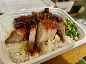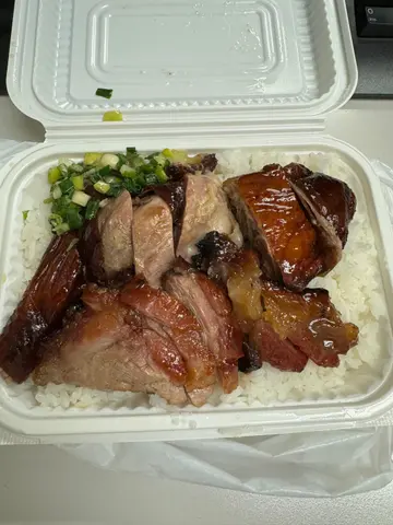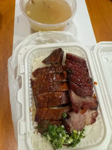 味道非常之好,而且量大,跟住仲要肉多。肉嘅份量好多,叉烧都有两款,味道好肉质靓,仲包埋嘢饮有汤或者系纸包饮品。饭上面仲会淋美味酱汁同埋姜葱,超正。日日食都唔厌。个汤虽然偏咸少少,但系好足料,有好靓嘅猪肉,同埋冬瓜去煲汤。本人喺附近做嘢,初头见到过铺头唔系太吸引 ,但系食咗一次之后,完全被吸引住,因为净系叉烧都有两款,有普通叉烧同埋古法黑叉烧,味道唔一样,我个人钟意吃叉烧多啲,烧肉嘅皮好脆,烧鸭嘅皮都清得好干净。