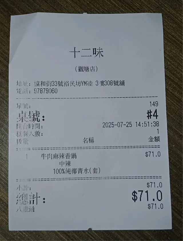 十二味 (觀塘裕民坊YM)。2025/July/Fri/14:51。1人共$71 免加一。⭐️食緊嘢,侍應係隔離掃地拖地,太唔衛生。.................⭐️⭐️位置,在商場內,算易揾。⭐️⭐️環境,空間大,坐得算舒服。⭐️👎服務,人哋食緊嘢,侍應係隔離掃地拖地,太唔衛生。.................⭐️⭐️牛肉麻辣香鍋午餐$63,量多,配料多,但唔夠熱,不似即炒。⭐️⭐️罐裝椰青水跟餐+$8,正常。.................九龍 觀塘 協和街33號裕民坊YM 3樓 308號舖觀塘港鐵站 A1出口...................…查看更多