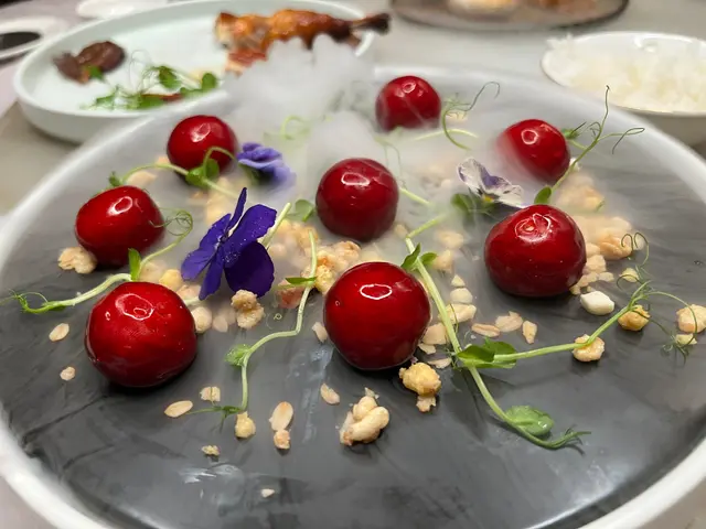 餐廳裝修雅致,不過大廳嘅位同位之間都少少逼。有兩個獨立房間。店員比較繁忙,要走出房間搵人先可以落單或者其他服務。前菜🤔櫻桃鴨肝 賣相華麗,但係味道不如預期。鴨肝醬嘅味道唔夠濃郁脂香。外皮紅色嗰層啫喱又唔脆身又唔軟滑,膠膠地嘅質地比較奇怪。味道係先咬到一層膠質黏黏嘅外層,然後食到非常之淡嘅鴨肝醬味,再加淡淡橙汁嘅味道溝埋一齊。