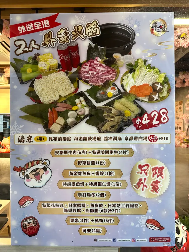 經常聽到被XX耽誤嘅XX。而在於小編嘅角度嚟講,千之味絕對係一間比壽司刺身耽誤咗嘅火鍋店🍲。點解小編咁講?只要你試過一次佢嘅火鍋🍲你就心中自有答案🤫。今次點咗2人外賣火鍋🍲,湯底係醬油湯底🥘🥘。肉類🥩分別有安格斯牛肉,特選美國肥牛同豬肉片。牛肉味道非常濃郁,而且帶有濃厚嘅牛肉香味。豬肉片軟嫩而唔會柴。野菜拼盤🥗🥗,包含金菇菜,娃娃菜,生菜,京蔥,冬菇等材料。另外仲有粟米🌽,萵荀。黃金炸魚皮+響鈴,炸魚皮脆卜卜。響鈴放入湯底輕輕拖一拖就食得🤤, 響鈴上掛滿了濃郁嘅湯汁。特級墨魚滑🦑+特級蝦仁滑🦐,墨魚滑爽口彈牙,鮮味香濃。蝦仁滑口感爽滑。手打烏冬口感彈牙。其他食物包括有特級花枝丸,日本蟹柳🦀,魚皮餃,日本芝士竹輪卷,蜂巢豆腐,廚師牌腸仔😋。除左配有醬料🧂例如,甜豉油,辣椒🌶️,生蒜🧄,炸蒜🧄,青蔥等等之外,餐廳亦都好貼心咁送左一個錫紙鍋🥘,咁就算屋企無鍋具都可以享受到呢個外賣火鍋😋查看更多