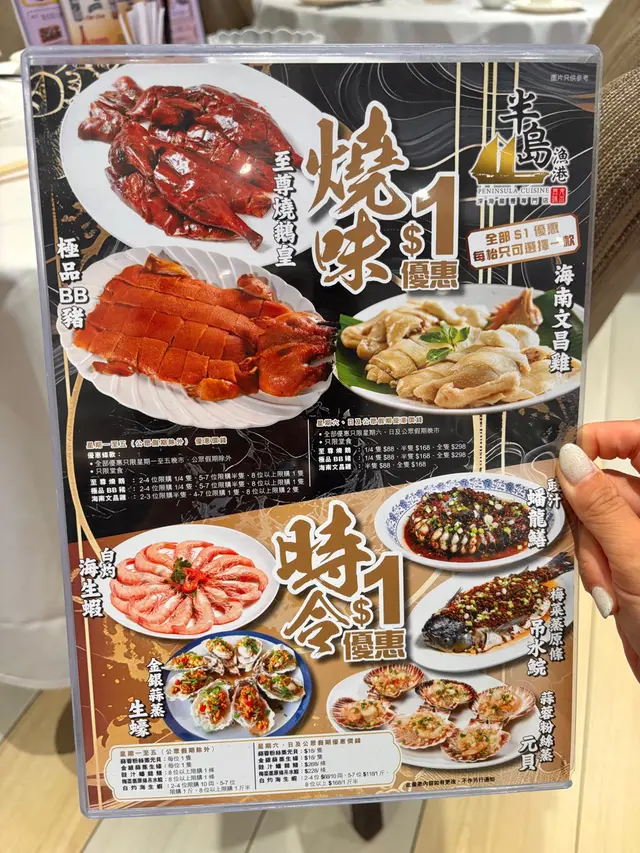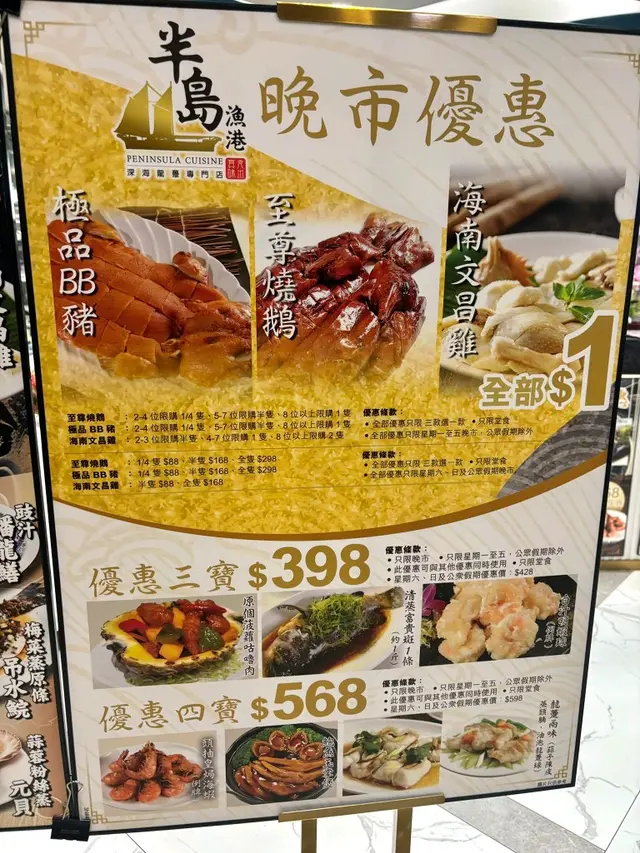 半岛渔港📍观塘秀茂坪秀明道101号秀茂坪商场2楼203号舖今日嚟秀茂坪同朋友食饭,一上秀茂坪商场2楼电梯就见到呢间酒楼,之前去过南昌𠮶间觉得唔错,一于再试下!极品BB猪($1优惠)一嚟就俾$1优惠吸引咗,如果唔食猪仲可以拣烧鹅或者文昌鸡! 🐷BB猪皮脆到咬落去「咔嚓」声,皮下脂肪好薄,肉嫩带微微炭香,抵食必点👍🏻精选三重彩(优惠价$338)套装包咗3个𩠌,上汤海虾伊面嘅海虾有半只手掌大,🦐虾嘅份量都几多,有十几只,肉质弹牙,伊面吸尽上汤精华,挂汁力max!姜葱台山桶蚝蚝身肥嘟嘟,🦪蚝肉咬落爆浆,姜葱镬气攻鼻,无腥味;淮山云耳炒鲜百合嘅淮山爽脆、云耳滑溜,百合瓣瓣清甜,食完浓味菜嚟一箸就啱晒大蓝瓜班两味乳鸽餐(优惠价$338)呢个餐可以叹到蓝瓜石斑一鱼两食🐟,翡翠炒瓜子斑球嘅斑球起得好厚肉,炒得嫩滑;蒜子陈皮蒸瓜子斑头腩钟意食鱼头腩嘅会钟意,部位多胶质,配埋蒜子同陈皮一齐蒸,辟腥之余带出香味;乳鸽即叫即炸,热辣辣上枱😋皮脆肉嫩,够晒咸香送饭一流呢间酒楼枱与枱之间够阔落,上菜速度快,好主动收碟换碟,服务唔错!走𠮶阵发现仲有做海鲜火锅放题,下次有机会要试下先