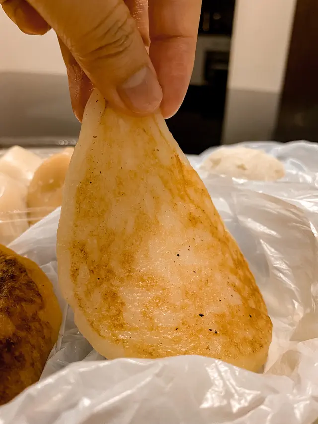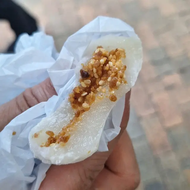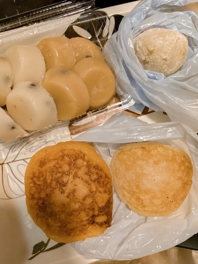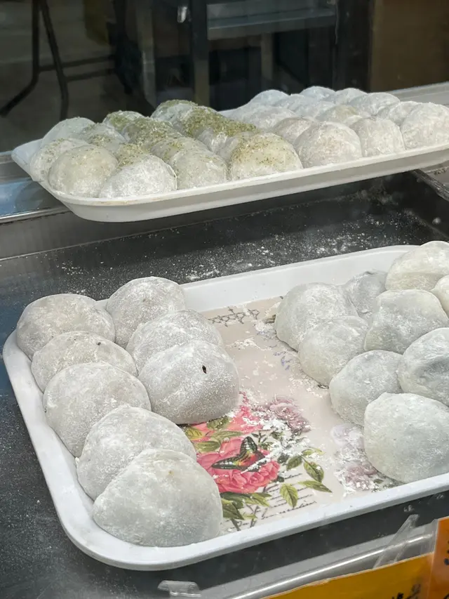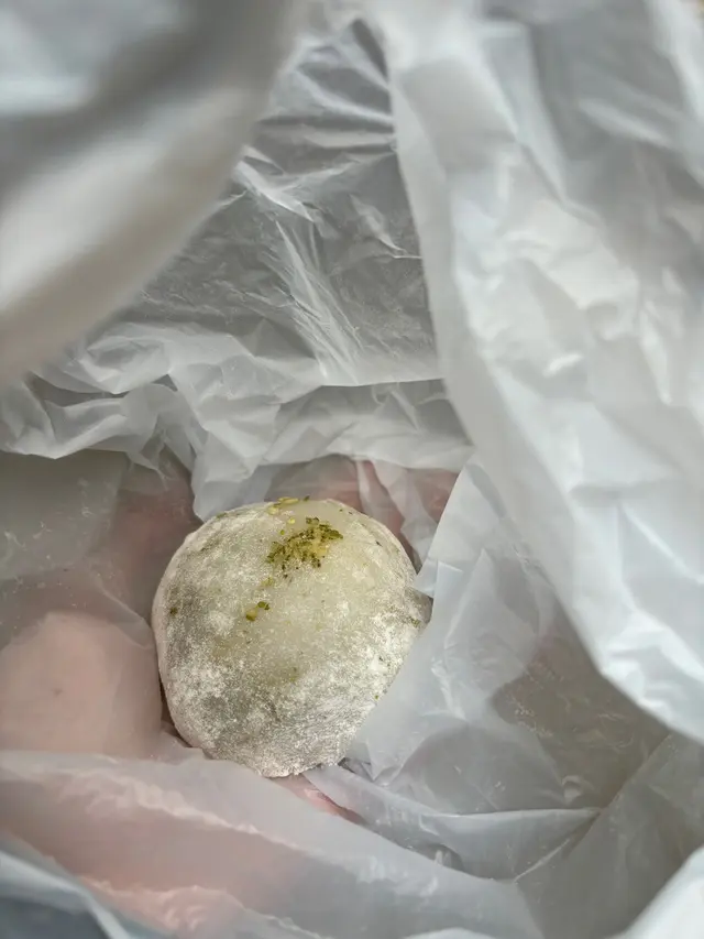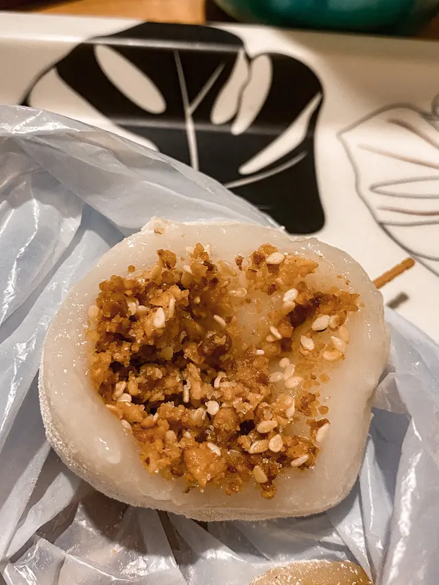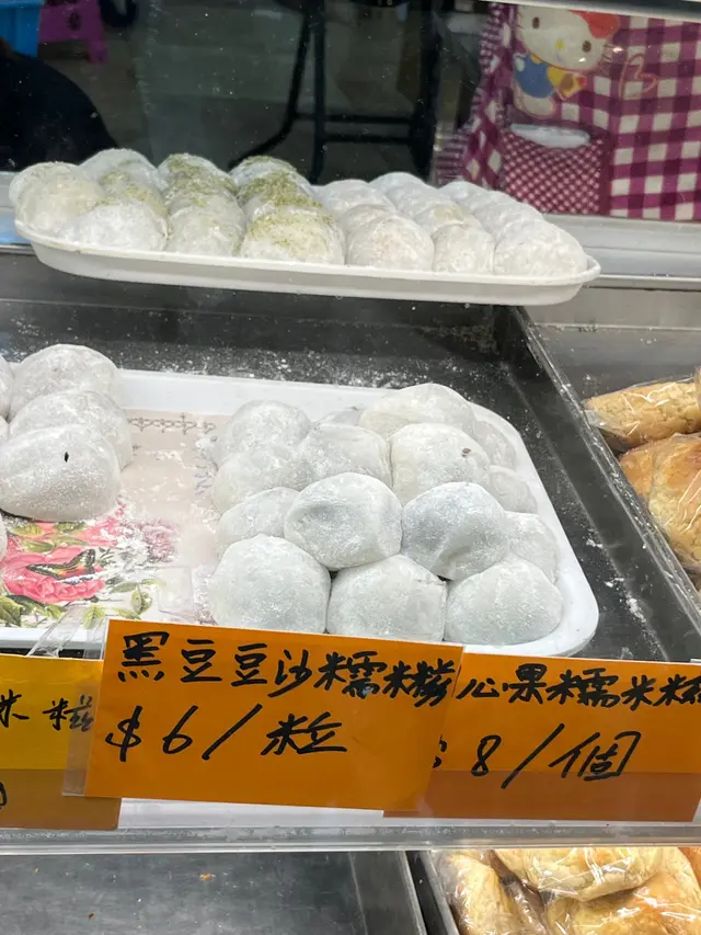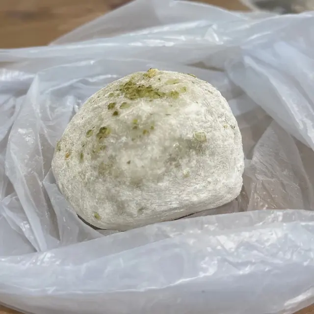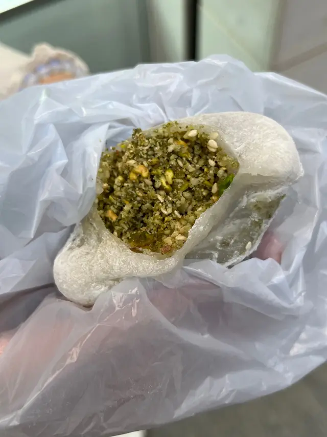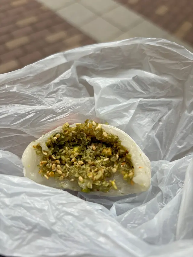 呢排好多食物都鍾意用開心果做材料,呢間老字號餅鋪都唔例外,於是我都試吓一個盛惠8蚊嘅開心果糯米糍體積正常,出面層皮好軟腍腍,好軟熟,入面啲開心果餡都幾澎湃,有好多開心果同芝麻,不過開心果味比較淡,亦食唔出芝麻嘅香味。佢入面濕濕地,應該係啲糖溶左,啲開心果粒同芝麻散修修咁,唔係好blend到。純粹以開心果糯米糍黎講,可以一試,但無下次