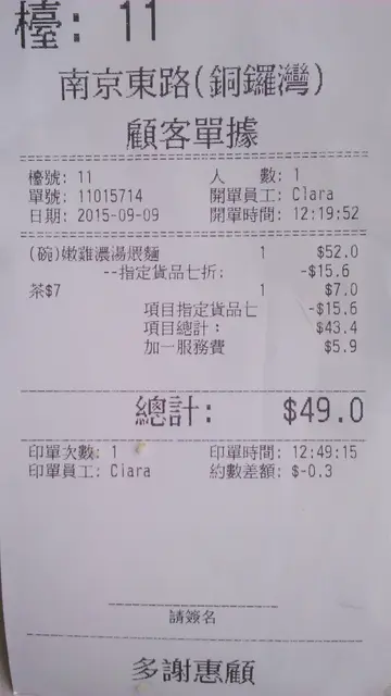 昨天去过中央图书馆欣赏书画展后,在皇室堡找馆子吃午餐,选择客人很少的「南京东路」,刚巧有优惠时段有七折。嫩鸡浓汤煨面$52,大家看见去皮鸡胸肉丁是不足十小粒,配切粒粒的爽脆小棠菜,和面条。真是适合我胃纳细的人士,也符合少肉的要求。最喜欢是那浓郁味鲜的浓汤,全碗面精华是浓汤,喝上八成多!加埋名茶$7,真系成肚水,本想吃甜吃~~豆沙窝饼,太饱,罢了!七折后盛惠$49,离开店铺,依然得几枱客人。