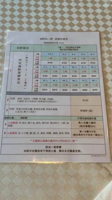 公道D讲,餐厅食物冇咩特别,不过不失,但收费离谱:1- 买左左蛏子加工,冇上到,照收钱同加工费。2- 街外海鲜档买海鲜的4490,餐厅亦计算加一服务费。事后打去反应情况,态度差,话有写清楚,系我自己冇问,当晚唔睇清楚帐单。我有部份责任,饮左两杯,即场冇为意加一计算方法有问题,亦之后先记起蛏子冇上。但7人消费9035,人均1300,街外买海鲜收加一,价钱离谱,顶级米芝莲3星价钱,大排档服务及态度。唔怪得当日公众假期,全场吉枱一大半,原来靠一两张大台胡乱收费生存,去唔去大家自行判断。Blacklisted!…查看更多