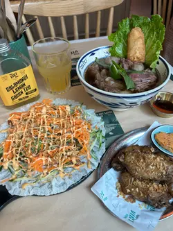 今日返工放半昼,所以就想揾个地方坐下休息吓~上网见到呢间楼上越南咖啡厅一于就一时究竟!!.咖啡厅大部份座位以梳化为主,坐落好舒服,而且有大玻璃射入阳光,冷气充足,感觉舒服适合一个人休息,或者约埋三五知己一齐食个饭。.叫咗佢哋嘅招牌金边粉,金边粉滑溜而且挂汤,饮到汤底浓郁~而且非常足料,有两大旧牛骨连肉,仲有牛筋、牛丸、生牛肉片,牛尾浓郁,而且食到唔同嘅口感!牛魔王必选🐮🐮我就比较钟意食佢哋嘅生牛肉片,生熟程度啱啱好,而且好嫩滑~另外仲有油炸鬼、生菜、辣椒、青柠等不同配料,绝对可以调配出个人化嘅口味!.另外试咗佢哋两款小食,分别系烤鸡翼同脆米纸薄饼。脆米子薄饼绝对系开胃菜,而且层次口感都好丰富,有米纸嘅脆口、腊肉嘅咸香、萝卜丝同青瓜丝嘅清新,配搭有趣,味道融和!两个人share食就啱啱好啦~小编食唔晒打包咗,米纸就多咗一份烟靭感,同样惹味~秘制炸萋叶鸡翼调味特别,一食落又好香嘅香草味,㗳真啲又会有啲咸香,加上煎得香口保持到鸡翼嫩滑,绝对系鸡翼控必须要encore嘅选择😂😂😂😂.饮品方面就拣咗柑桔柠檬绿茶,一上枱竟然系用玻璃樽装,即刻有一个去咗越南嘅感觉,感觉好高尚😂🫣亦都系因为咁就算唔用冰杯饮其实都好够冻,就咁饮会饮到好香浓嘅柠檬香,后尾慢慢就会渗出柑橘味,加咗冰饮反而令到入口多咗份冰凉感~啱晒而家热辣辣嘅天气🥹.餐厅仲推出左印花卡,储够印花仲可以减钱,真系抵到烂,下次可以叫埋朋友一齐黎食lu~…查看更多