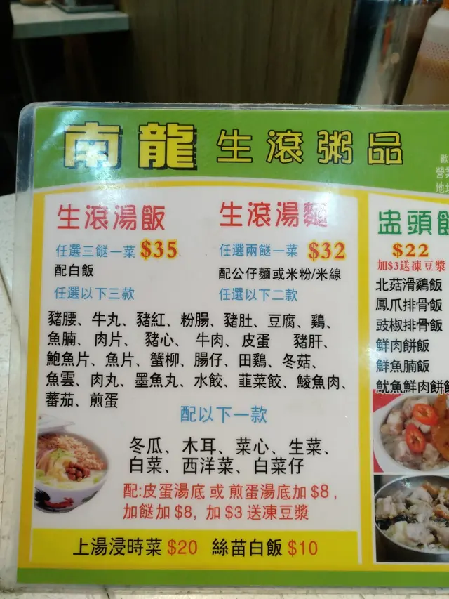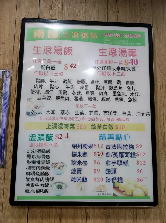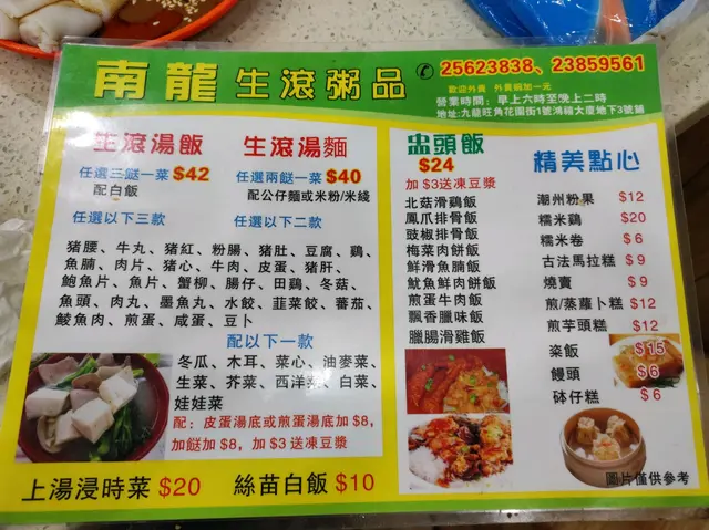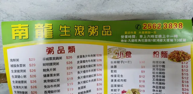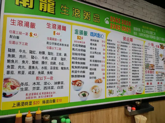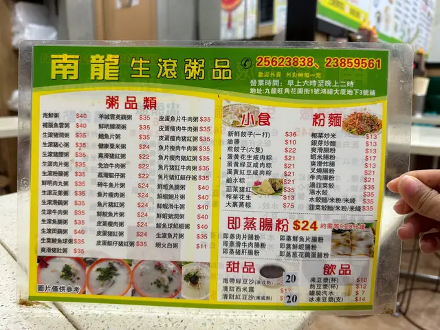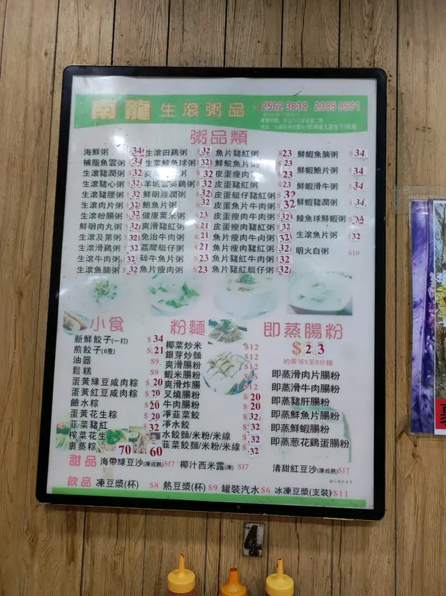 南龍粥店 (旺角) 网址: https://s.openrice.com/QrLS0SBa900 地址: 香港旺角花園街1號鴻禧大廈地下3號舖 电话: +852 23859561