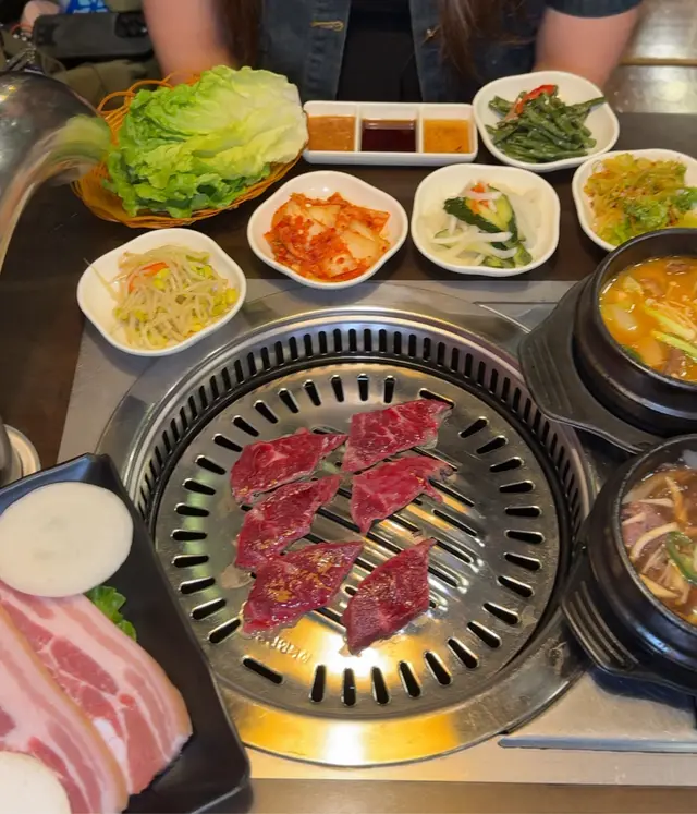 好耐冇食過韓國嘢,放工走咗去韓國街食,呢一間見到佢晚市都有做套餐,好似幾抵咁,就入去食咗。我哋點完嘢食之後店員就送上前菜,有5款咁多,好豐富。燒肉套餐有牛同埋豬嘅選擇,我哋就梗係揀咗牛啦。套餐包咗一個燒肉,兩個主食,其實兩個人都夠飽,不過我哋就好大食,叫多咗個飯卷。我哋揀咗個板腱肉,都幾大碟,牛肉顏色都幾靚,雖然食落去唔係太多油脂,但係口感都唔會話好靭。我哋燒得朝朝香香,然後沾上燒肉醬汁,配上泡菜,再用生菜包住食,味道一流。辣海鮮豆腐湯呢個湯估唔到佢又幾鮮味,唔會太辣,有啲蜆、各款蔬菜、雞蛋,仲有唔少得大大嚿嫩滑豆腐。所有嘢都入晒未,夜魅得來又鮮甜,我哋成鍋湯飲晒。石鍋拌飯呢個石鍋拌飯簡直係我哋食韓國嘢必食,熱辣辣嘅石鍋令到啲飯有少少微微焦香,個底仲有少少飯焦,而且材料好豐富,除咗有牛肉、仲有唔同顏色嘅蔬菜、紫菜同埋蛋,加入韓式辣醬拌飯,冇得輸。紫菜包飯個紫菜包飯又係簡單得來超好食,飯粒煙靭煙靭,用紫菜包住。飯卷裏面有腸仔、蔬菜同埋蛋,色彩繽紛。…查看更多
