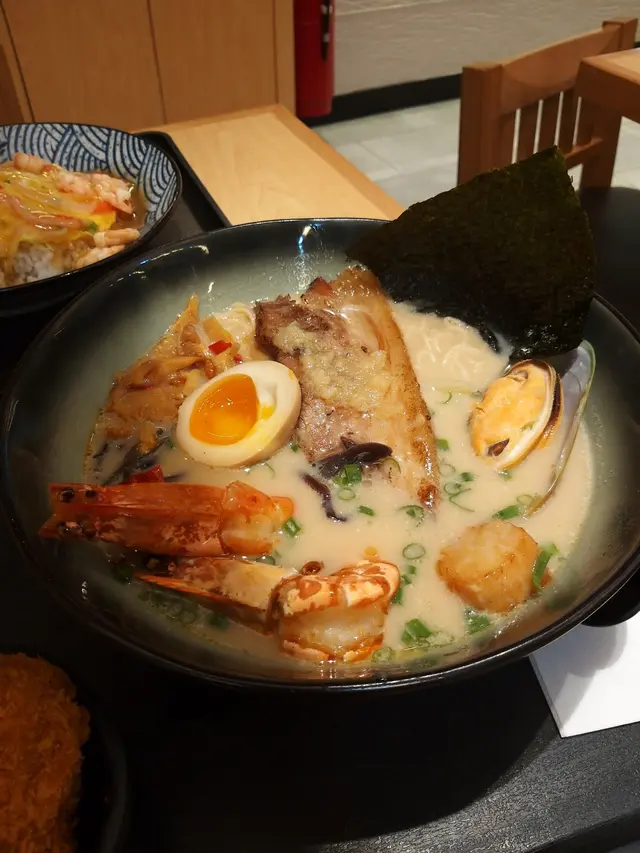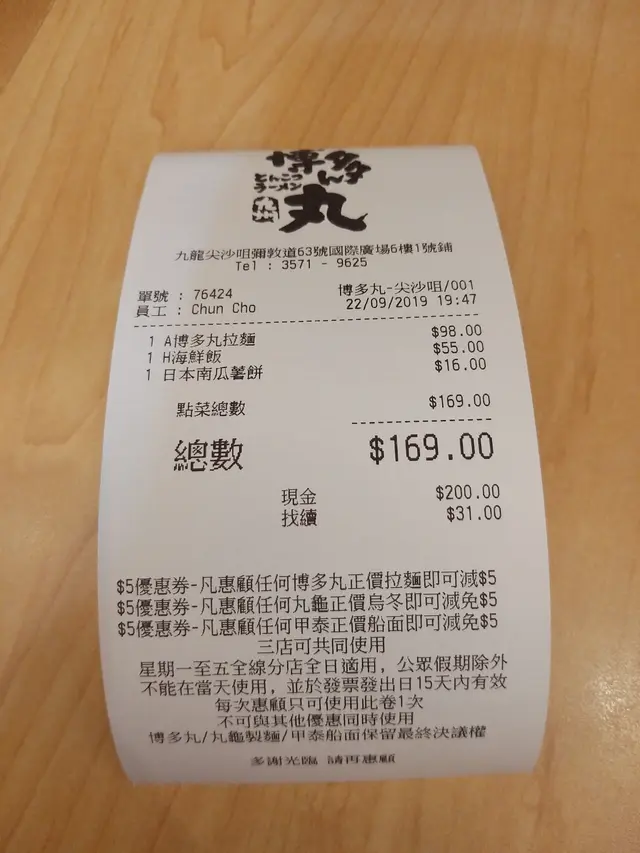 有事要出尖沙咀處理,之後就隨意的來到 ISquare晚飯整個商場都相對很靜然後又隨隨便便的來到了博多丸老公點了博多丸拉麵,我就點了天津飯另外加了塊南瓜薯餅博多丸拉麵,即海鮮豚肉拉麵配料都算多,海鮮有蝦﹑帶子及青口,還有塊腩肉!還有紫菜及溏沁蛋~拉麵是幼麵,麵質都會過稔,算是ok湯頭是豚骨湯,但並不特別濃郁,味道一般~由於配料有限,我就沒試啊!天津飯,即海鮮飯,屬日式中華料理一般做法是將蟹肉及蟹黃加到雞蛋,另加上芽菜﹑蝦仁等配料,還有厚厚的芡汁!上菜時見到有不少的蝦仁,但沒什麼色澤,賣相不算很討好!蟹肉及蟹黃就不覺,但有些蟹棒絲配料雖齊,但整碟飯的味道很淡口~~!!蝦仁及蟹棒絲也沒有味道!感覺整碟飯很頹!炸物類是先炸好,放置在counter讓食客選取南瓜薯餅不是新鮮即炸起,所以不是熱騰騰的薯餅不會太油膩,炸漿不會太厚南瓜味幾香甜,算是不錯~~食物味道實屬一般,價錢亦不算很便宜不太值得再光顧~本身因自己吃的天津飯而想給喊臉,但薯餅及拉麵還可就勉強給予OK吧!查看更多