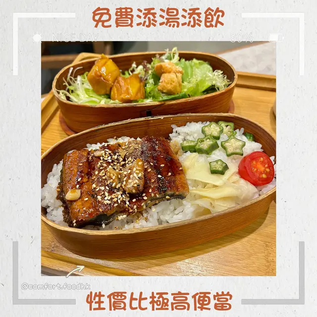 Intro: 新蒲崗真係有好多民生餐廳,今次就去左比較隱蔽嘅餐廳(又一間),佢地主打平價嘅便當,款式極多,仲可以免費添湯添飲,真係包保食到好飽,另外加熱飲要$4,加凍飲要$3;___________________🍽 蒲燒鰻魚便當💰 53 ⭐️8/10✍🏻 整個餐除左有一盒鰻魚飯外,仲有一盒雜菜沙律,再加一個茶碗蒸;✍🏻 鰻魚唔會多骨,口感偏冧,雖然就比較細條,但味道都同香港坊間嘅餐廳差唔多,如果鰻魚汁多番少少會更好;✍🏻 雜菜沙律就相對上唔算新鮮,細心啲就發現有兩粒限定嘅炸燒賣送,都幾新穎又唔會太肥膩;✍🏻 茶碗蒸蛋滑但唔會太多水,算係唔錯嘅茶碗蒸。✍🏻 有麵豉湯同羅宋湯任飲,正正常常,飲埋湯一定會飽肚。___________________🏠 又一間📍 新蒲崗大有街34號新科技廣場地下7-8號舖⭐️ 8/10___________________查看更多