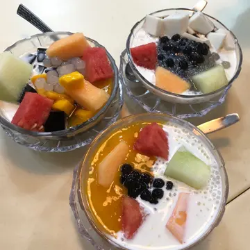 系荃湾食完牛扒,天气咁热紧系同朋友食埋糖水先归家啦,顺便倾多阵计嘛。星期六既关系,到处都劲多人,间间都爆晒,企到出门口!等左好耐,仲比人打左几次尖先有位坐底⋯⋯坐底就即刻叫左个芒果水晶冻粉$38芒果唔酸,但亦唔系太甜,水晶粉都够冻,整体都算唔错!透心凉得黎,又唔会冻到牙震震!朋友叫左个蛋白炖鲜奶 $32好普通,又唔会难食,只系无乜特别。食落暖暖地,唔会太热!另外仲叫左2个夏日恋人$40/个〔1个朱古力雪糕,1个云呢拿雪糕〕卖相几特别,用椰皇装住益力多沙冰,再放上芒果同雪糕,沙冰入面仲有其他配料例如:珍珠,令到口感丰富,不过沙冰太冻,好快食到牙震头痛😂整体都系一般,普通啦!