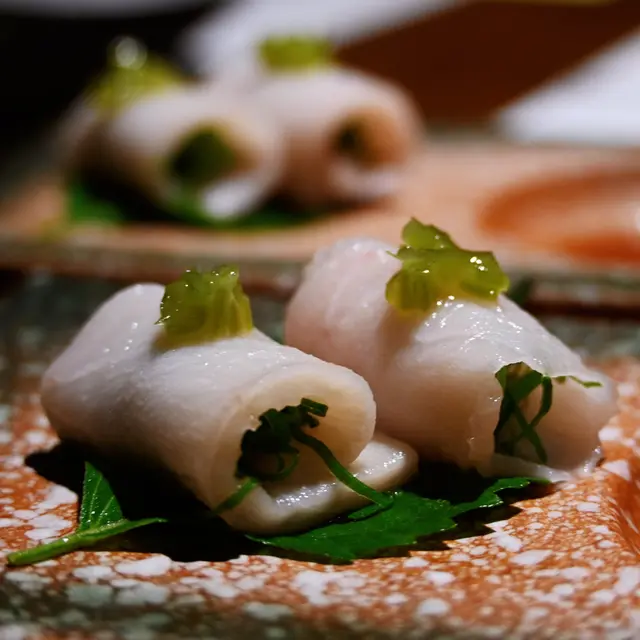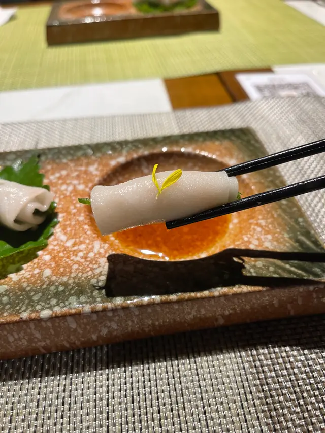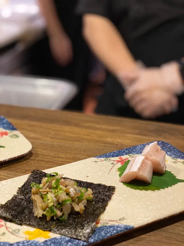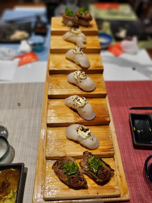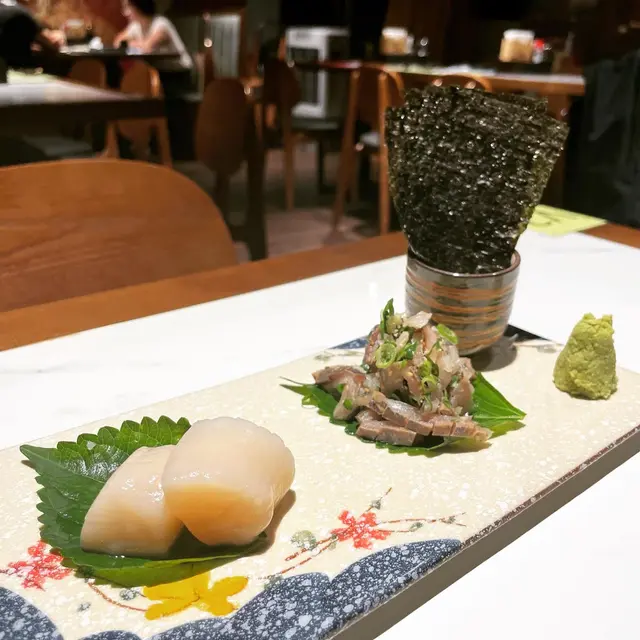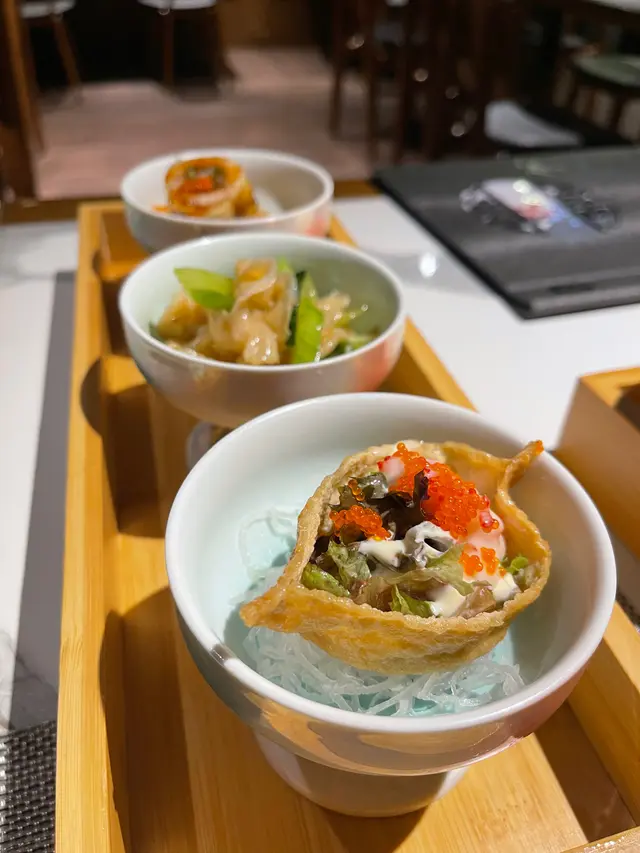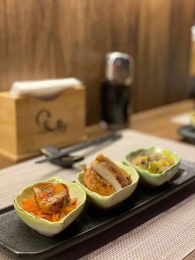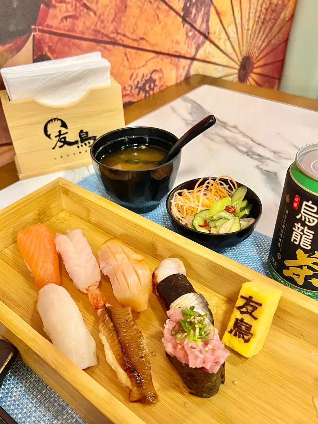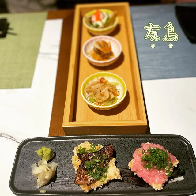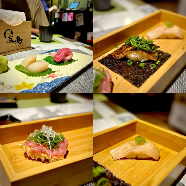 最近朋友推介觀塘的「友鳥」提供性價比高的omakase,總共有16款料理,人均消費只是$500。除了提供廚師發板,餐廳還有其他日式料理可供選擇。螢光魷魚冷盤魷魚鹹香煙韌,有沙律墊底,用來平衡味道白玉豚刺身是白拖羅的一種,可沾點酸汁。入口滑嫩,內裏包上蒽絲。串燒雞軟骨油脂感重,建議可加跟上的沙律或檸檬汁,減低油膩感。火炙左口魚蔥花絲、紫菜,用紫菜包住壽司。入口微甜,充滿左口魚的魚脂香。車厘茄豚肉車厘茄燒到熱辣辣,小心燙口,車厘茄汁併發出來好juicy。拖羅米通拖羅蓉放在米通上,拖羅蓉肉質細膩,加上脆卜卜米通口感香脆,不錯。玉子牛卷蔥絲放表面,牛肉片包裹住一塊玉子,微甜玉子不會搶去牛肉的味道。天婦羅炸蝦炸蝦新鮮炸起,口感酥脆,並伴有白蘿蔔蓉、天婦羅汁,醬汁令天婦羅炸蝦更為清爽。醉鮑魚鮑魚預先處理好,切成塊狀上枱。酒香明顯,鮑魚有咬口,辣椒絲微辣,刺激味蕾。鵝肝壽司鵝肝燒得焦香,配上微涼的壽司飯,口感香濃細滑。岩鹽燒雞翼雞翼燒得剛好,加上岩鹽簡單調味。鰻魚壽司相當吸引,鰻魚肉口感滑嫩,沒有細骨,加上壽司飯一齊入口好滿足。雜菜素湯烏冬內含粟米、木耳、竹筍、海帶、烏冬,份量十足,素湯清甜。海鮮味噌湯材料有豆腐、蜆肉、帆立貝、海帶、蟹柳,以味噌湯底為主軸。燒菠蘿木魚絲做點綴,味道酸甜多汁。紅豆椰汁糕、雲呢拿泡芙椰汁糕清甜,加上紅豆做點綴,附有忌廉泡芙和黃豆粉蕨餅。…查看更多