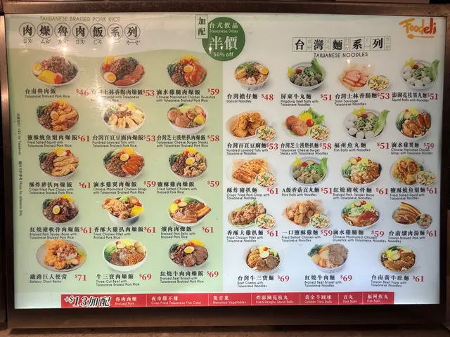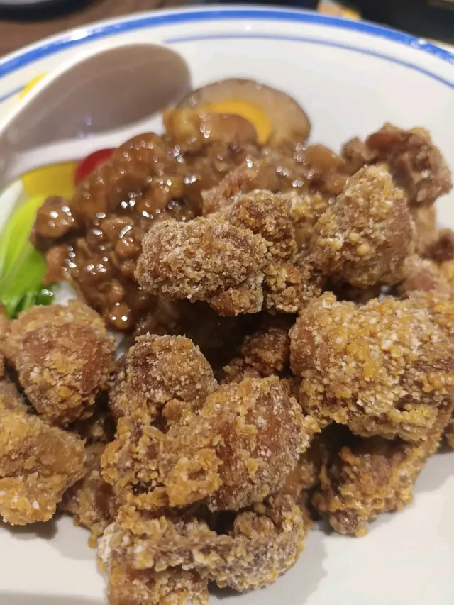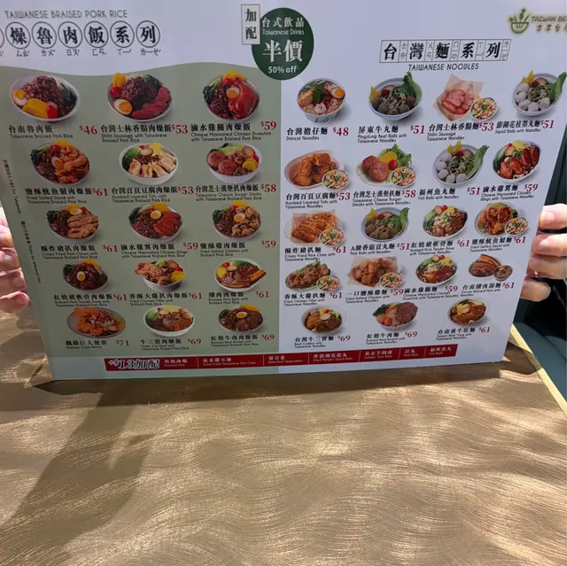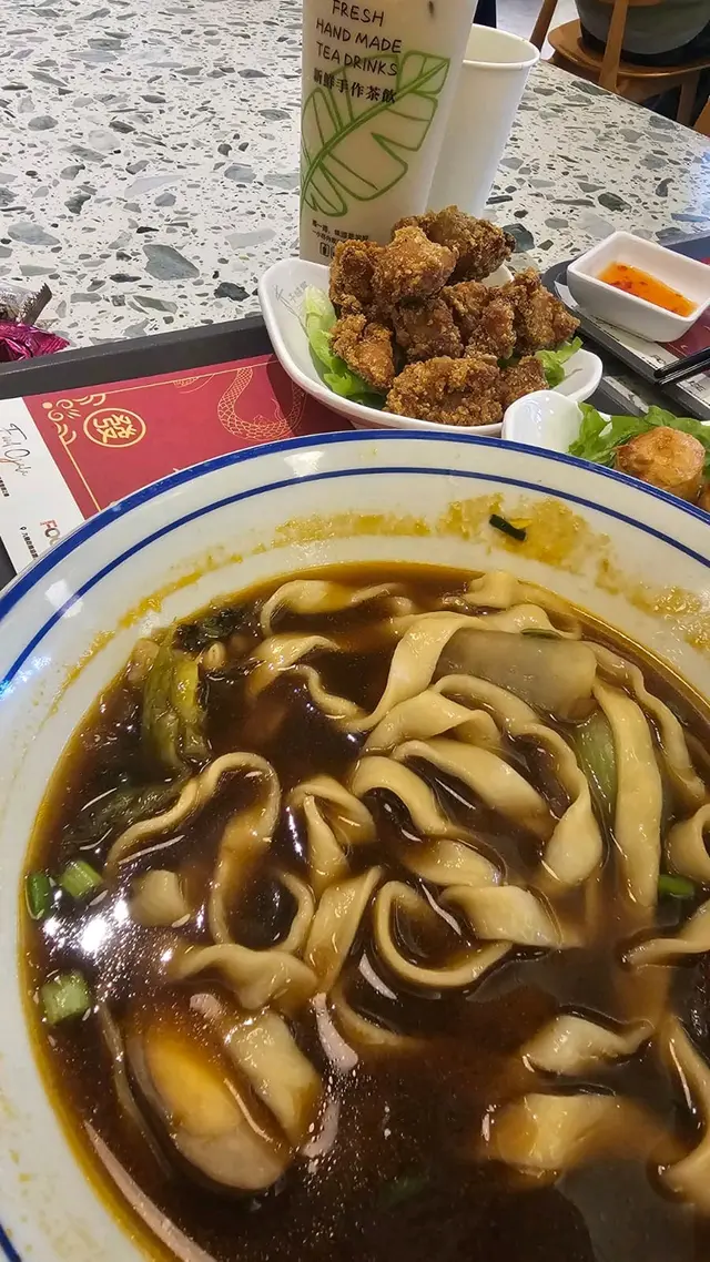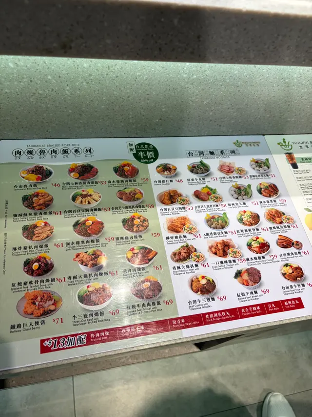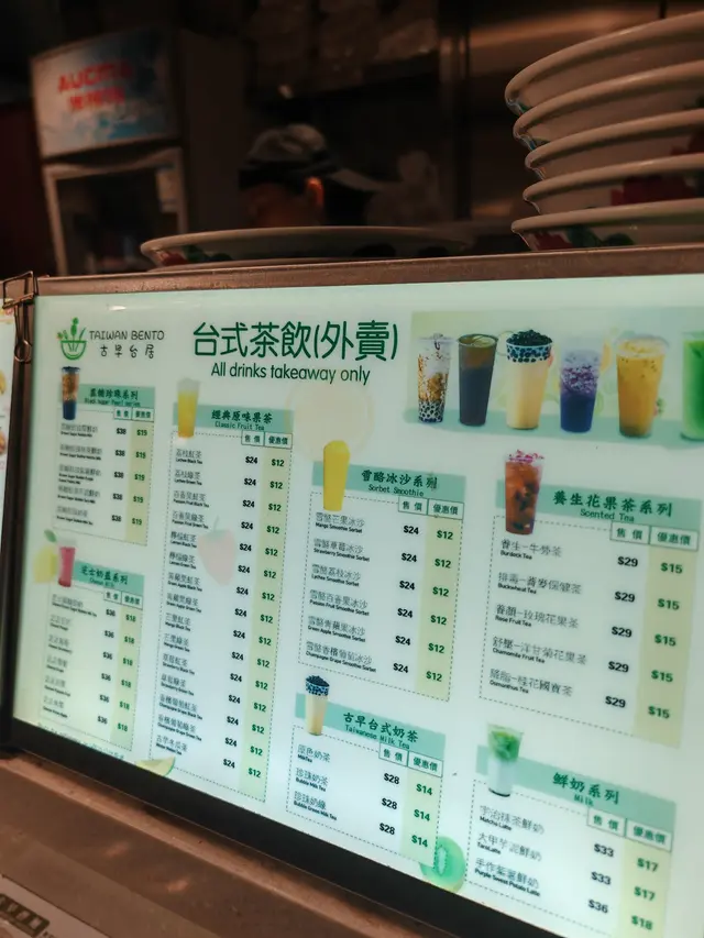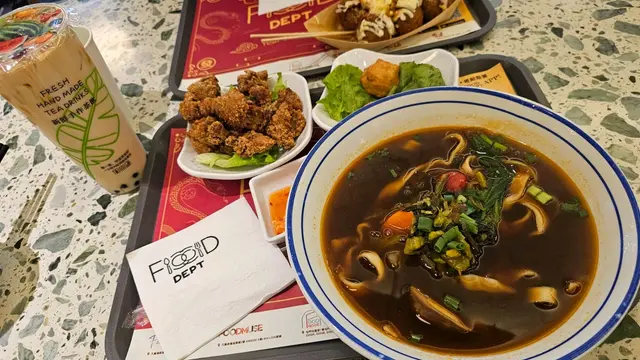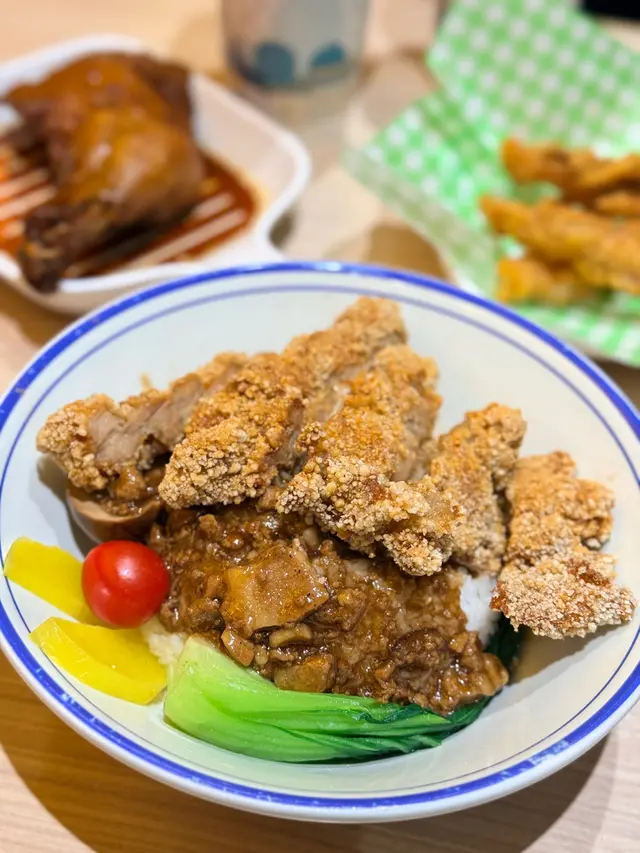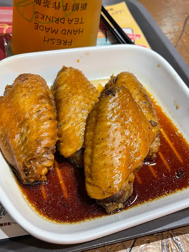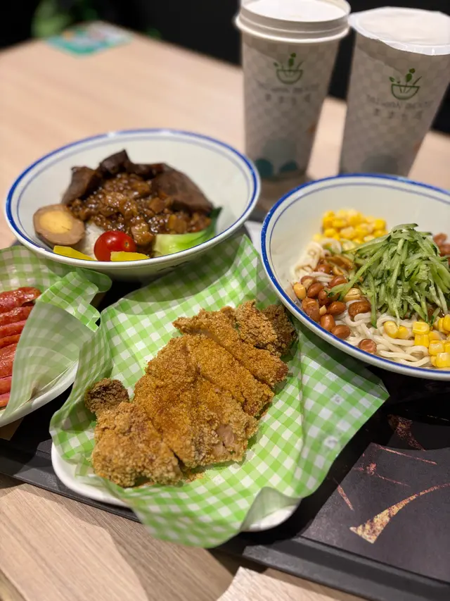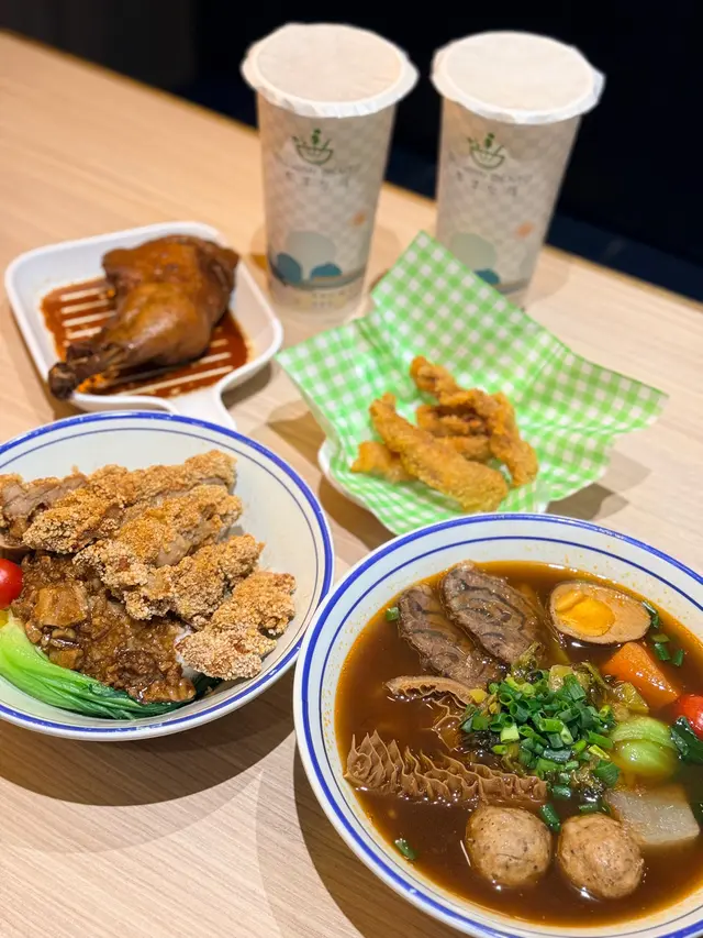 今日響德福行街,晚飯時候去咗美食廣場食台灣嘢,大大份,味道不錯,平時做飯堂都ok。鐵路巨人便當真係好巨大,飯上面鋪咗層肉臊,再上面係炸雞扒,最上面仲有炸豬排,另外仲配有滷水蛋伴着,真係份量十足。豬扒同埋雞扒都好大塊,大過我隻手。肉燥撈飯冇得輸,炸豬扒同雞扒都熱辣辣,啖啖肉。紅燒牛肉麵湯底味道都幾濃,紅燒牛肉係牛腱,口感唔錯,啲筋位好Q彈。個麵係台灣麵,厚切粗麵,好Q彈,配菜仲有蘿蔔,紅蘿蔔同埋半隻滷水蛋。台灣百頁豆腐呢個小食好好味,熱辣辣,台灣百頁豆腐除咗滑之外仲有啲彈嘅口感,好好味。椒鹽魷魚鬚同樣新鮮炸起上枱,非常香脆,椒鹽味好惹味,而且裏面嘅嘅魷魚鬚好新鮮,有鮮味。宇治抹茶鮮奶跟餐加$17就有,大大杯,甜度適中,抹茶味香醇,仲有粒粒紅豆響裏面。黑糖珍珠厚鮮奶呢個間餐加$19 ,同樣大大杯,珍珠好Q彈,而且好多,黑糖鮮奶香滑好飲。…查看更多