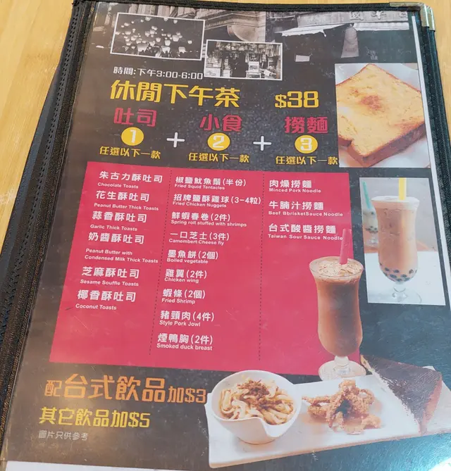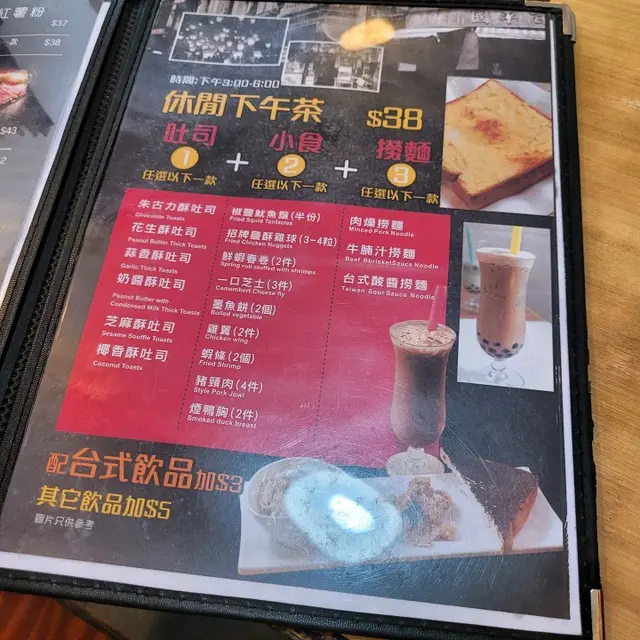 台式休閒下午茶,可選A吐司+小食+撈麵($38),配台式飲品加($3)