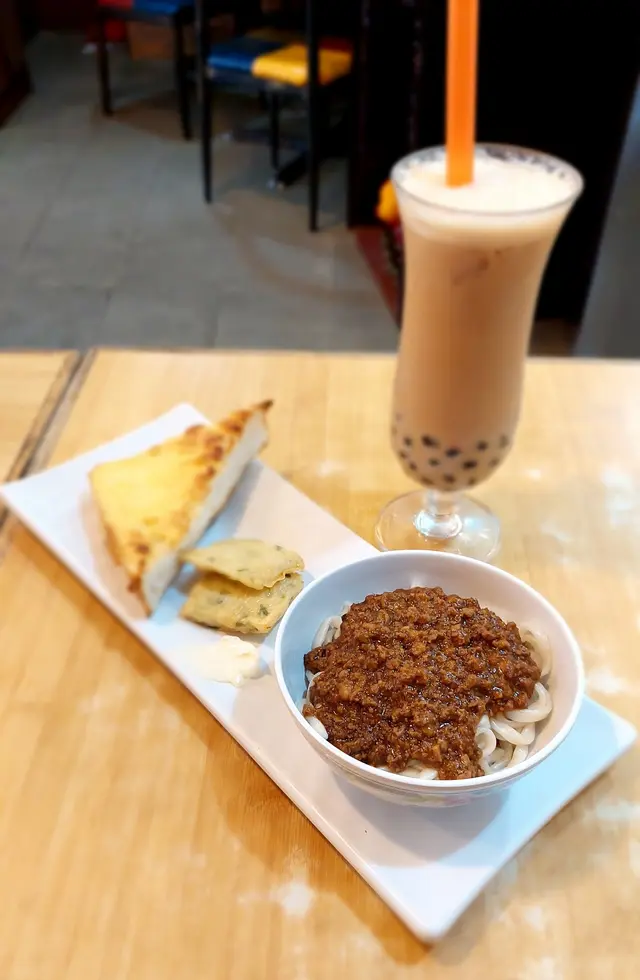 椰香酥吐司+墨魚餅+肉燥撈麵+珍珠奶茶($43)