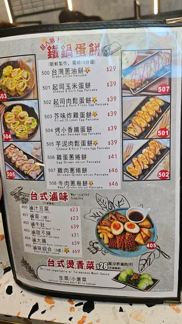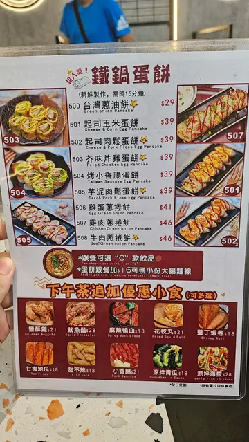 与一班朋友在附近做完运动,到这餐厅聚一聚聊聊天。四时后才进店,食客不多,选了一列长台坐下。这店卖台式食品,下午茶花样也不少,精选三重凑,有三款食物任配搭,又有多款蛋饼可选,另有十款可追加的小食,适合贪心的人。我们六人点了三份蛋饼和一份面加些小吃共品尝。小食要了黄金豆腐和甘梅地瓜。豆腐炸得很干身,像臭豆腐的质感,内软外脆,不过没有什么味道,店员拿了些孜然粉给我们,这样伴吃才有点味道。地瓜也是炸过的,不过地瓜本身有甜味,所以吃起来香甜脆口,味道不错。蛋饼是台式食物最普遍的食物之一,今次我们要了三款。台湾葱油饼,不用太多配料,只是用葱匀和在饼皮内煎得便可,一大片圆型葱油饼切开八件上台,饼底不厚,口感软糯又酥香。芋泥肉松蛋饼,切开有六件,每件都醮上了甜酱,饼皮内卷上了绵密的芋蓉、蛋皮和肉松,口感充实。牛肉葱卷饼,长条型的卷饼上台时已切开四份,饼内葱和牛肉片满满,同样在饼面醮上甜酱,牛肉片腍滑易吃。麻酱鸡丝面,是一款拌面没有汤的。面内材料有花生碎,青瓜丝和鸡肉丝,白芝麻。面内有麻酱,把所有材料和面条拌匀就可吃。面条弹牙,青瓜丝爽口,酱汁味适中。台式食品还是最喜欢吃蛋饼。