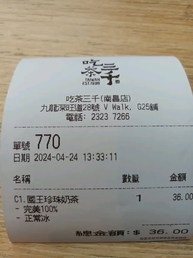 吃茶三千位於V Walk商場地下,位置便利,店內裝潢簡約明亮,以木質調為主,營造出舒適的氛圍。雖然店面不大,但設有少量企位,方便顧客享受現萃茶飲。吃茶三千最大的特色就是使用萃茶機現萃茶葉,每杯茶飲都能品嚐到茶葉的原汁原味。茶底選擇豐富,包括烏龍茶、紅茶、綠茶、青茶等,每款茶底都經過精心挑選,風味獨特。凍頂烏龍鮮奶是一款經典的茶飲,吃茶三千的版本茶香濃郁,口感醇厚,值得一試。如果你喜歡烏龍茶,或者想嘗試一款香濃順滑的鮮奶茶,這款飲品絕對不會讓你失望。國王珍珠奶茶 這款是店內的人氣之選,紅茶底香氣濃郁,搭配Q彈的珍珠,口感層次豐富。建議選擇半糖或少糖,更能凸顯茶香。吃茶三千的現萃茶飲確實值得一試,茶底香濃,真材實料。雖然價格略高,但考慮到其品質和製作過程,還是物有所值。如果你喜歡品茶,或者想嘗試不一樣的茶飲體驗,吃茶三千是一個不錯的選擇。查看更多
