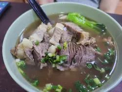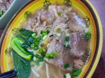 将军澳私人居屋屋苑「富宁花园」地舖,除了有我上次购买过人手制作汉堡包的西式小食店「尼X食店」之外,还有一些潮州粉面店跟港式茶餐厅可供选择,问题在于食客想不想看电视新闻报导而已。例如「富宁花园」在面对着「宝宁路」的其中一个大型地舖里面,开设了一间潮州粉面茶餐厅食店,食店的实际名称叫做「合兴咖啡粉面」,同时有提供潮州粉面和茶餐厅食品饮品。「合兴咖啡粉面」里面单是牛腩的款式,已经有至少三款不同部位的「牛腩」,包括一般的牛腩、「崩沙腩」和「坑腩」,「崩沙腩」跟「坑腩」比一般牛腩昂贵约港币十五元有多。结果我只是选择了享用,一碗简单的「牛腩面」,面底选择了「粗面」我做底。跟著在选择一般「牛腩粗面」作为晚餐之后,再加三元换购了一支玻璃樽装忌廉汽水饮品。「合兴咖啡粉面」厨房里面制造出来的「牛腩粗面」,粗面面条属于有少许卷曲,呈现波浪形态的薄身面条。这种薄身扭曲形状面条本身口感在未渌熟之前,本来已经是有弹性,所以制作面条时,连加入碱水这步骤也可以省掉。所以「合兴咖啡粉面」利用这种本来已经存在弹性口感的波浪型薄身粗面,加上看似是「爽腩」,外表布满大量疏散小孔,切成一块块份量的牛腩跟薄身粗面,最后淋上汤汁,洒一大羹葱花就完成了。由于「合兴咖啡粉面」餐厅里面的电视机,电视机播放的新闻台新闻报导内容未免有点碍眼,所以我除了拿着手机,对着餐厅电视机拍了一张楼面照片之外,其余时间都是背着电视机,二话不说尽快食完「牛腩面」就算。「合兴咖啡粉面」「牛腩面」里面的牛腩,「爽腩」铺排在汤底和薄身粗面的表面上,「爽腩」实际味道则因为吸收过厨房的咸味汤底,所以偏向有偏强的咸味感觉。至于「合兴咖啡粉面」「爽腩」里面的实际口感,「爽腩」表面那一层的皮口感偏向比较硬,但是「爽腩」夹心和看到有疏洞位置的牛肉,口感相对表面那层牛肉而言,则比较爽脆和易嚼。所以「合兴咖啡粉面」「牛腩面」里面的疑似「爽腩」的牛腩,牛腩口感给我感觉十分复杂,又有「爽腩」的爽脆口感,偏偏又有像「坑腩」夹杂脂肪的油脂肥腻感觉。但是由于「合兴咖啡粉面」牛腩外层那些牛肉味道比较咸的关系,加上又有大量葱花,导致整碗「牛腩面」实际上整体的味道,也都被那些肉质偏瘦,口感偏硬的皮层牛肉所影响,变得有点咸,需要中和一下。所以「合兴咖啡粉面」单拼面套餐里面另外附上的甜味樽装忌廉汽水,在这个关键情况之下,就刚刚好能够大派用场,稍为能够中和「牛腩面」牛腩肉里面的咸味,和偏浓油腻口感。加上「合兴咖啡粉面」小支装玻璃樽忌廉汽水,如果配一碗「牛腩面」的话,价钱变成只需要港币三元,令整份「牛腩面」加樽装汽水套餐价钱变得颇为便宜,埋单给港币三十七元就立刻完成了。不过在「合兴咖啡粉面」声浪颇大的电视新闻台骚扰之下,我被迫不断加快速度享用「牛腩面」,还未能够再深入一点感受「牛腩面」汤底咸味和其他味道,就食完面和尽快结账离开餐厅了。虽然「合兴咖啡粉面」里面又有潮州粉面食品,又有制作和提供港式茶餐厅,可能餐厅里面放置了电视机,电视机还在播放新闻报导,滋扰我的电视新闻报导声浪很讨厌。当时我已经背向电视机,专心一意食完手上的「牛腩粗面」,和喝光手上的玻璃樽装忌廉汽水之后,就马上付款结账,取回收据马上到附近巴士站,坐巴士返回西贡墟。如果一般港式茶餐厅,或者粉面店里面的电视机,电视机声浪比较细小的话,我最多都是只是一只手按着一边耳朵,背对电视不望着,尽快食完整碗面,三扒两拨食完粉面就立刻结账。但是换着「合兴咖啡粉面」楼面电视新闻报导里面的声浪,我食到一半始终还是忍耐不住,悄悄地跟餐厅里面的侍应说,「对不起,麻烦你能否把电视里面的声浪尽量减低一点?谢谢」!