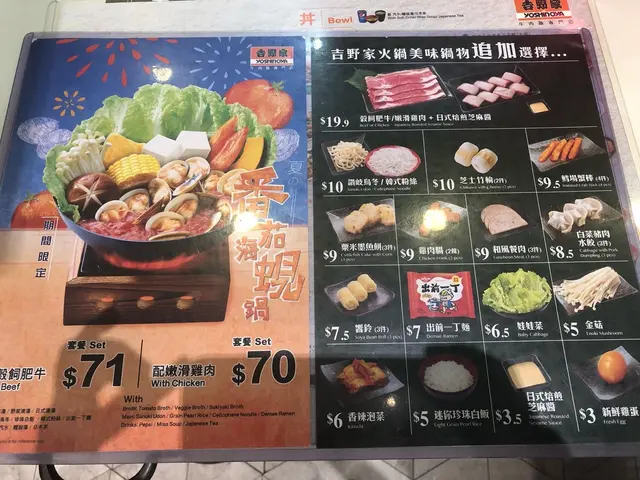 6:45pm到左APM 想找d經濟實惠的晚餐吃,諗到吉野家,好即刻去🏃🏼‍♀️🏃🏼‍♀️🏃🏼‍♀️,但都9成8的座位坐滿,好好彩,見2人前座位有人走,即時有位。火煱有兩種,一個相樸煱,一個蕃茄蜆煱。最後決定兩個人一個相樸煱,追加其他食物。追加了午餐肉,餃子,菜,嚮玲,牛肉,粟米餅。原來多過$130,汽水免費升大杯庒👍🏻👍🏻選擇濃湯,二個人都好飽,抵食👍🏻👍🏻👍🏻查看更多