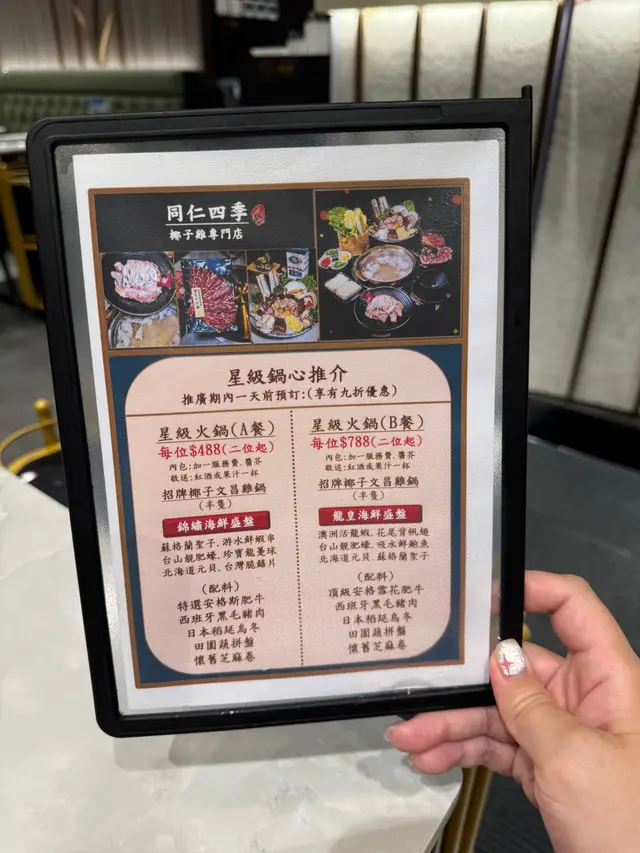今次去左朋友係荃灣返工嘅好介紹,唔係荃灣人都未必搵到嘅同仁四季椰子雞專門店!星級火鍋A餐 $488一位(兩位起),仲包加一服務費同醬芥,預訂仲有九折優惠,送紅酒或果汁一杯,開餐氣氛即刻升級🍷🍹。🖤招牌椰子文昌雞鍋湯底清甜,用左100% 椰汁做湯底,店員仲細心拆埋椰肉加入湯到,愈煲愈出味!而且精準控制火侯時間,保證雞肉嫩滑,啖啖都食到雞油香同椰子味,口感一流。🖤海鮮拼盤同樣新鮮,有蘇格蘭聖子、游水鮮蝦串、台山靚肥蠔、珍寶龍躉球、北海道元貝同台灣脆鱔片,每款海鮮都新鮮彈牙,鮮味十足,令整個火鍋層次更豐富🦐🦪🐚🖤安格斯牛、黑毛豬肉,兩樣都好有水準,最後仲有懷舊芝麻卷做甜品成個火鍋餐夠晒豐富,預早訂仲有九折,性價比高,值得一試!🍲🥥Read More