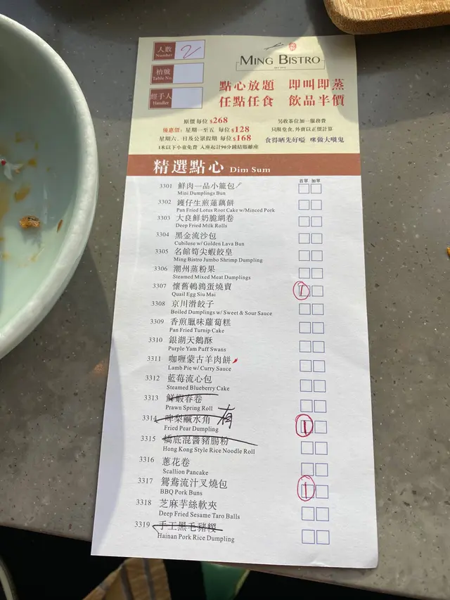 📍#名館📍Ming Bistro 🇭🇰香港銅鑼灣軒尼詩道500號希慎廣場14樓1401號舖🇭🇰Shop 1401, 14/F, Hysan Place, 500 Hennessy Road, Causeway Bay, HK🌐銅鑼灣 🌐中環 🌐紅磡人均消費: HKD180味道: 👅👅👅👅賣相: 👀👀👀👀價格: 💰💰💰💰環境: 🌹🌹🌹🌹服務: 👨🏻性價比: ⭐️⭐️⭐️⭐️回頭率: 🔆🔆🔆本來想去中環分店試試十三么甜品,因時間關係去不了,就去了銅鑼灣分店,誰知沒有十三么甜品😂😂餐廳在希慎14樓,尚算方便!環境十分開陽,坐窗邊可以俯瞰銅鑼灣下午時段有點心放題,$168/位,不過看過點餐只好決定還是散點好了😅⭐️紅燒嫩滑妙齡鴿🐥$58乳鴿賣相和平時食的差不多,燒得紅噹噹很靚肉質的確十分嫩滑,而且乳鴿味道香濃惹味,食得舔舔脷🆗芝麻醬雞絲粉皮🍝$58芝麻醬雞絲粉皮的醬汁我覺得是OK中規中矩的問題在於粉皮跟平時吃的有點不一樣,粉皮比較厚身,比河粉更厚,口感不太好花生碎很多,但青瓜太少了⭐️鎮江水晶餚肉🐷$48水晶餚肉都不錯,裏面的餚肉肉味重,十分香口,啫喱位置如果味道可以更香濃就較為理想啫喱位置看到好像百福豆腐盒的形狀,影響觀感😂😂😂⭐️灌湯鮮肉小籠包🥟$68小籠包$68有五隻,都不算貴看起來十分乾,沒有水份似的,但其實裏面真的有好多湯!味道不錯,可惜上枱時只是和暖,不夠熱💯咖喱蒙古羊肉餅🥠$58明明說是羊肉餅,我一直以為是類似清真牛肉餅那種😂😂😂其實只是一層一層的薄餅,羊肉就吃不出來了,但值得一試是咖喱味超級香,一份有差不多二十片左右,十分抵吃⭐️宮庭點心盤🍱$128十三么麻雀甜品就吃不到了,就來個比較養眼一點的宮廷點心盤🤩 點心房一共有五款食物:🔴名館筍尖蝦餃皇:蝦餃肥美,外皮煙煙韌韌,蝦味香濃🟠野菌冬菇包: 個包真的做得非常非常似冬菇!而且非常軟!裏面係有點像齋菜的餡,十分好味🟡天鵝紫薯酥靚靚天鵝紫薯酥!紫薯酥超級鬆化!裏面紫薯勁香勁軟!🟢網紅小白兔得意小白兔,可惜兩粒黑芝麻放得不好,變得楚楚可憐!小白兔咬起來十分煙韌,似是用糯米做的,但有美味的椰香🔵綠茶慕絲慕絲口感十分滑,綠茶味不會太重,適合不饞甜的人⭐️橋底混醬豬腸粉🥢$38看起來沒有平時的腸粉那麼吸引,但想不起混醬起來又十分惹味雖然位於銅鑼灣,但食物出品水準和擺設設計都算出色,性價比頗高!但服務態度就真的嬲到爆炸!1. 我們坐在外面,但沒有一個員工是在外面的,每次找人都花勁多時間2. 分別找了三個員工要一杯暖水,結果要第四次才有3. 我把點心紙和筆放在另一張櫈上,有個員工竟然用非常鄙視的眼神問我為什麼放在這裏,然後他收走了4. 因為想再加單,唯有問員工在拿點心紙,結果到時沒有給我的我一向對於餐廳服務態度沒有太大要求,只求中規中矩,今次真的真的十分不舒服,所以回頭率略減!…查看更多