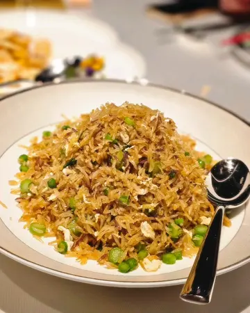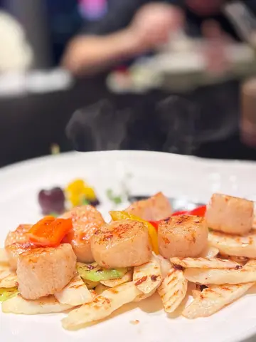 这次点了主厨套餐前菜是鹅掌、鱼饭还有自家制萝卜和青瓜,青瓜萝卜口感爽脆非常入味,萝卜还辣辣的很有湖南风味;炖汤是象拔蚌仔紫菜汤,服务人员会在面前把高汤倒入装着象拔蚌的碗,仪式感十足。炖汤是象拔蚌仔紫菜汤,服务人员会在面前把高汤倒入装着象拔蚌的碗,仪式感十足。热菜有:黑松露蟹黄鱼翅炒花胶,选用上乘花胶,非常厚实,蟹黄鱼翅花胶融合在一起的口感真的绝了,很有层次!豆仁咕噜雪花牛肉,第一次吃这么精致的葫芦牛肉,酸酸甜甜的调味搭配肥美的牛肉,还有最嫩的翠绿🫛豌豆仁,多巴胺色的搭配食欲满满。白辣椒小米花螺,第一次吃湘菜做法的花螺,肉质爽弹加上这个辣辣的调味真的😋!最后一道热菜是清蒸深海红斑,比较清淡来做结尾,鱼的肉质很鲜嫩。甜品:雪耳炖官燕,甜甜的带有桂花味衬托了燕窝,热热的做了一个完美收尾。这家店的餐具很讲究,每个客人都是不同的图案,还有地毯的图案也是牡丹花,连包房的墙壁都是刺绣制成,很适合商务宴请,所以有低密度要求的朋友也可以直接预约包房,有无敌海景的哟!服务人员很专业,很耐心的讲解每道菜还会回答客人的问题!