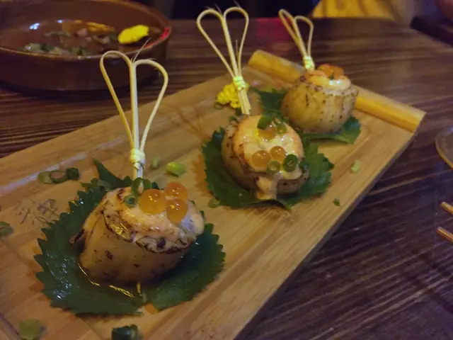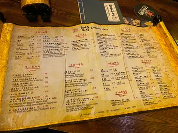 皇帝风格酷炫日本居酒屋,适合打卡拍照。来这里一定不是为了吃饭,而是感受环境的。位置在soho,爬了好久的大坡。菜谱是圣旨,酒水单是醉拳秘笈,菜名都贼有意思,可以免费借店里的古装拍照。门口人山人海,作为一个bar,自然是嘈杂的,我以为到兰桂坊了,倒是适合晚上来喝酒。食物就麻麻。🌟🌟🌟牛魔王(窝蛋安格斯肥牛丼) $118份量很大,上面一层铺的都是肉,我饭量不算小,吃完肉层没吃饭就饱了。肉的质素就一般,比吉野家好小小,不是厚肉片,是薄的肥牛片。有酒味,偏甜,洋葱倒是很好吃。🌟🌟🌟夜光杯(三文鱼子海胆杯) $88容器和菜名很特别,适合拍照again。三文鱼子和海胆很新鲜。杯子下面是饭,混了海苔末和拌饭素。🌟🌟🌟烤秋葵串 $18冇乜特别,搭配点蔬菜啫。