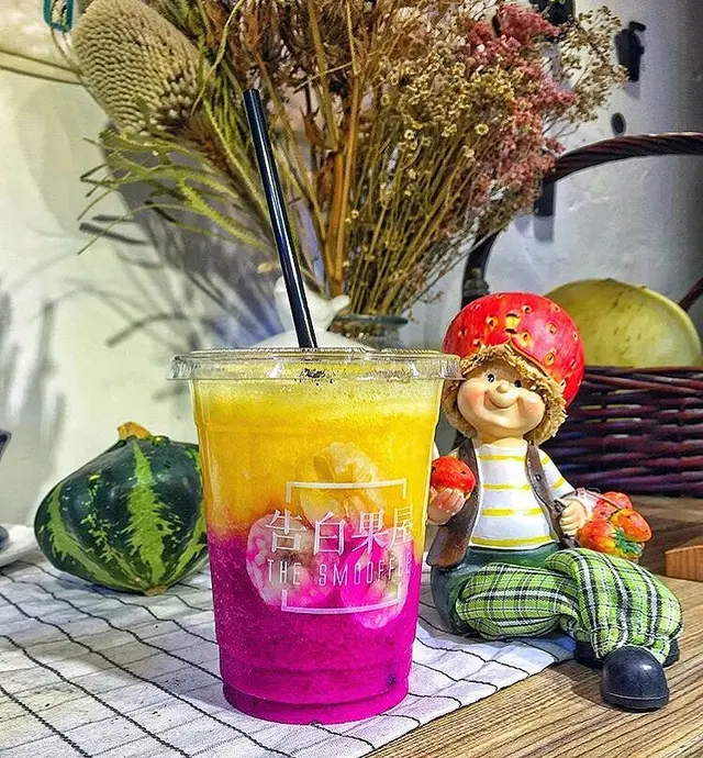 即叫即榨的水果奶昔专门店,装横具有文青风格,饮品卖相讨好。