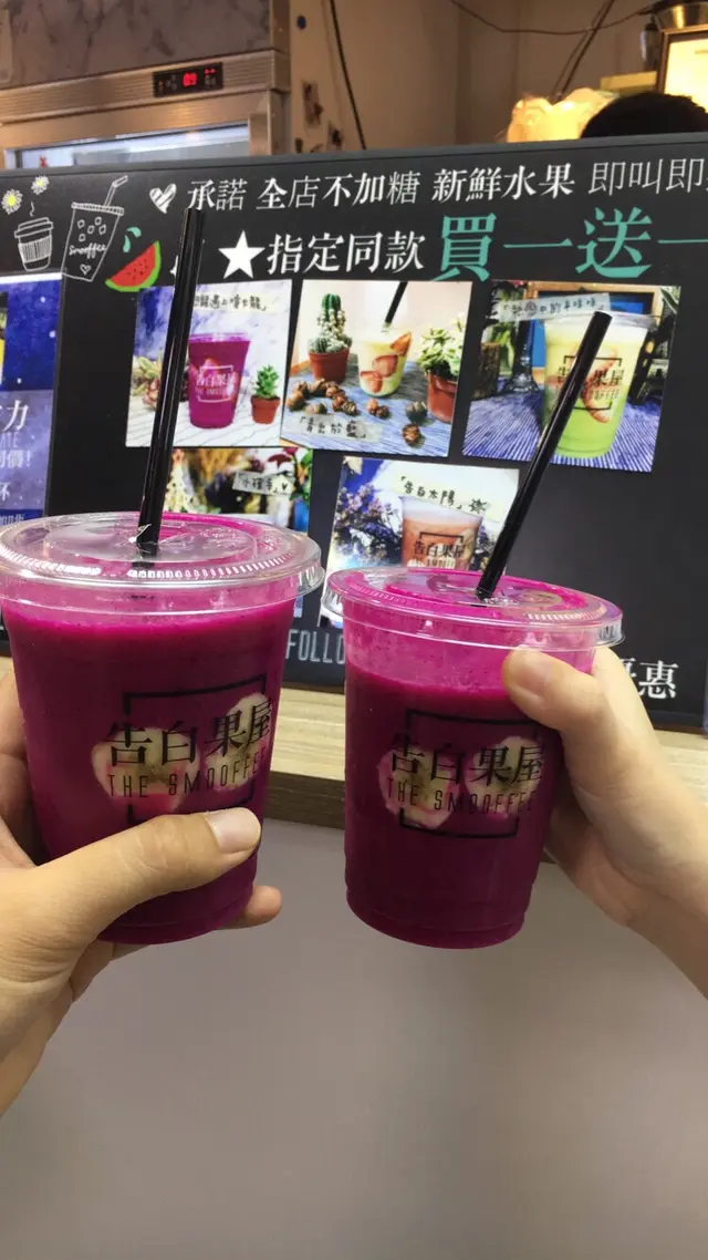 黎得葵芳掃街,一定係想一次過食勁多款小食但係有時太重口味,都要飲d野清清味蕾,先可以再戰第二round!告白果屋有不同水果配搭嘅果汁,有d會有買一送一,有d就直接有優惠,而且優惠定期會轉款,無論係一個人黎,定兩個人黎都輕鬆拎折!而我今次就叫咗恐龍遇上噴火龍,唔係好記得有咩水果,淨係記得一定有火龍果,勁高纖!好似仲有淡淡嘅蘋果香添!我個朋友飲完都好中意,想再encore多杯不過仲要留肚食其他小食,就唯有留到下次再戰啦!查看更多