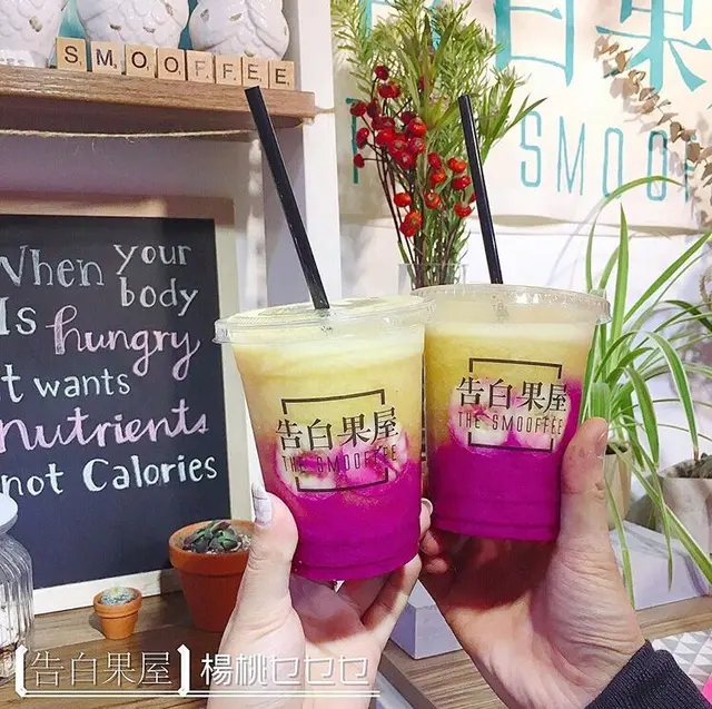 中女扮文青,放工去左葵廣,天氣熱加口干干,好想飲杯野refresh下,雖然周圍泛濫珍珠奶茶,但中女年齡最好唔好旁晚仲飲茶同咖啡啦,好易心跳手震今晚眼光光訓唔著嫁嘛! 見到小清新門面0既「告白小屋」就已經心心眼,標榜水果清新飲品,仲寫埋有咩療效,顏色仲配襯得鬼死咁靚,重外表既梗係要馬上一試!最重要長期有五款推介飲品係買一送一,最啱姊妹淘!最後我哋試咗:1)楊桃乜乜乜-降血脂、消炎楊桃、火龍果、蘋果、橙2)糊塗飛鴿水蜜桃🍑士多啤梨、提子、蘋果、乳酪以貌取人協會理事都讚,用左香蕉🍌片/士多啤梨片裝飾杯面,再配上粉紅色、螢光桃紅色、鮮黃色嘅果汁,齋用隻眼睇已經令眼睛懷孕🤰🏻!飲落去不得了,先打果汁唔加冰,果然清新怡人查看更多