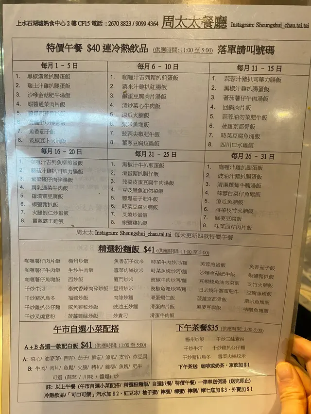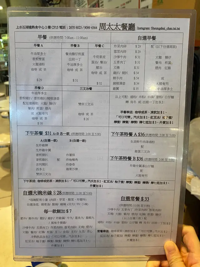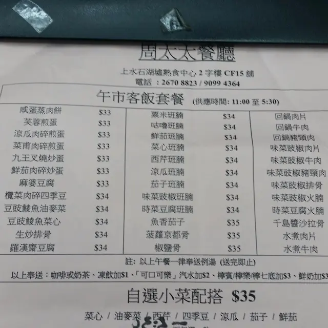 周太太 (上水) 网址: https://s.openrice.com/QrLS0dae700 地址: 香港上水智昌路13號石湖墟熟食中心2字樓CF15舖 电话: +852 26708823