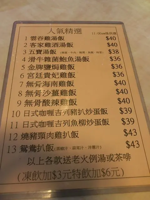 噚日中午要到尖沙咀做嘢咁就喺附近睇吓有乜好食啦,見到味皇有冇骨海南雞飯,沙薑雞飯同其他幾款雞飯,見佢主打雞飯諗住冇衰啦,點知就咁賴咗嘢,一入去就睇睇餐牌,一於叫沙薑雞飯,點知一叫完都唔夠一分鐘就有個呀姐放個下午菜牌落嚟,原來佢一點半已經有下午茶,頂又唔出聲,早知叫咖哩啦36蚊已經有,想問佢改唔改得碟飯已經到,算!一睇個樣已經覺同張相相差好遠,啲飯質好差,一望就知好乾好硬,又有啲白有啲黃,好肉酸😨😨,啲雞切到好大舊,好肥好肥,其中竟然有舊頸皮,冇肉放落去都係想整到好多雞咁啫,都算,食啦,咬開咗啲皮諗住咬一啖…點知係咬唔開!勁un!咬極都咬唔開咁唯有成舊食,唉真係un到好似食香口膠咁,乜雞嚟㗎!似煲湯嗰啲老雞多啲囉,仲有雞下面啲生菜,黃到我諗佢都冇諗過有人會食囉,成碟飯難食到,仲要45蚊,早知去食老麥好過,啲飯應該同餵豬啲差不多,真係比一日我都食唔完,呢世我都唔會再嚟!…查看更多