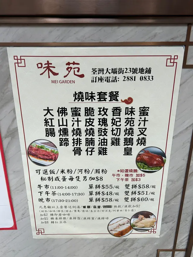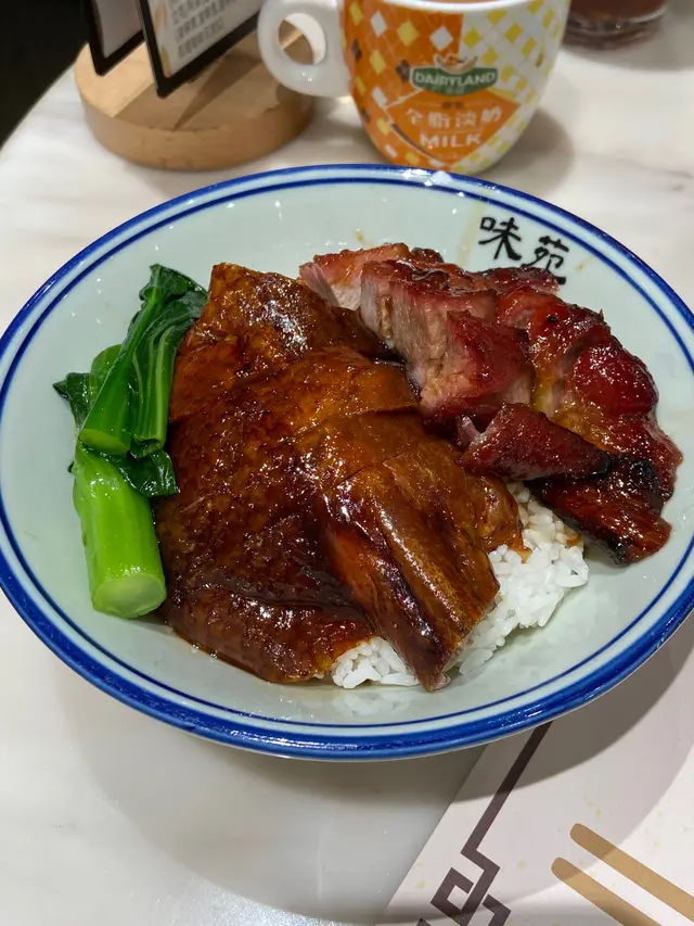 荃灣大壩街味苑燒味,見open rice 內的食評唔錯所以入去。味道中規中矩,不過我唔好彩,師傅斬了啲下難燒鵝比我,燒鵝只有肥膏和骨,但燒鵝肉就沒有太多。下午茶$58,算是偏貴。嘗試過一次就算,個人覺得榕哥會更好!另外,冷氣機壞了,店內下層頗熱,此店有上層,我表示想上去上一層,但侍應唔比,身完一身汗。說實在,你上層有冷氣都唔比人上去,下層壞冷氣就叫客人坐下層,估計最大原因是侍應不想行上一層送食物,但這樣的安排,我應該就唔會再來!!…查看更多