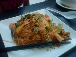 记得两年前操过一份会考中文的pp,说到浪费食物的问题,内容是说吃到很饱仍硬塞直至吃光才是浪费其实我也满同意的,一来吃得太饱短命,二来吃完又花尽心思减肥真是太痛苦但是,吃不完的要倒掉真的太浪费打包又不是常可以做的事(很多时都会有点不好意思)所以,当我知道姊姊和姐夫来这儿吃,我就知道我一定不能自己叫一个餐,因为我没有可能吃得完(不叫餐比打包更方便)。当然,虽然我在家已吃了很多很多芝士多士跟芝士pizza,但我总会口痕,不可能看着他们吃~所以,我还是每碟吃了约1/3!因为实在太大碟了!青咖哩猪扒饭:有两三旧味道勉强合格的薯仔,挺多好好吃好松软不会韧的猪扒,我没碰过的洋葱和椒。青咖哩还好啦,不会太稀,不过太辣了,是我这辈子暂时吃过最辣的青咖哩,幸好有好多白饭捞,不然辣死人,overall不错,因为猪扒味道质感真的很不错。炒金边粉:$3x个,有汤有餐饮,算是ok啦~汤不会只有水,而那个咖啡听说很差很差。同样地这个的size也是极大,金边粉中有花生碎,中型虾,超微型虾仔,豆类的条状物体,芽菜,葱等,炒得不算油了,也不会太湿,味道不算浓,真合我口味。不过姐夫则觉得有点太甜,可能老外跟我们香港人不同口味啦。好开心,最后我们三人合力食完好饱,又不算饱到死,又没有浪费一包包的砂糖有xmas包装的,很应节其实这儿的食物都不差,而且款式真是多到......为甚么会没甚么客人呢泰式中式西式等,甚么都有,虽然有些不太正宗,不过不代表不好吃ar~:)…查看更多