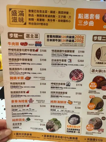 - 汤底搭配:佢拣咗麻辣灵魂锅,一边系昆布柴鱼锅,但是麻辣锅,辣度唔算太强,啱晒佢。- 配料够诚意:蔬菜拼盘份量足,仲有虾滑、豆腐、冬粉等,唔使额外加配都够饱。甄选海陆套餐- 海鲜新鲜度不错 :虾、鱼片、 带子、 鱿鱼、花蛤都冇雪味,煮完唔会缩水,食落口感唔错。- 肉类搭配平衡:牛肉片唔算厚,但不会太韧,配埋芝麻酱好唔错,好味。- 汤底:我拣左椰子马蹄锅和黑松露浓汤锅,味道清甜, 好香的椰子味,煮海鲜特别好味。