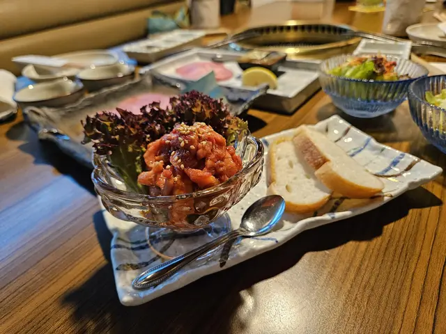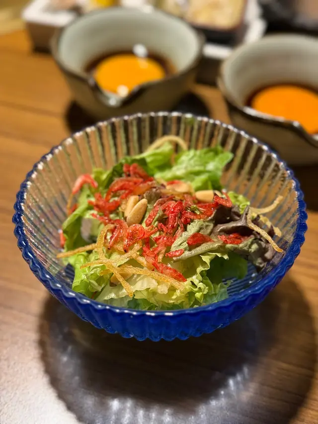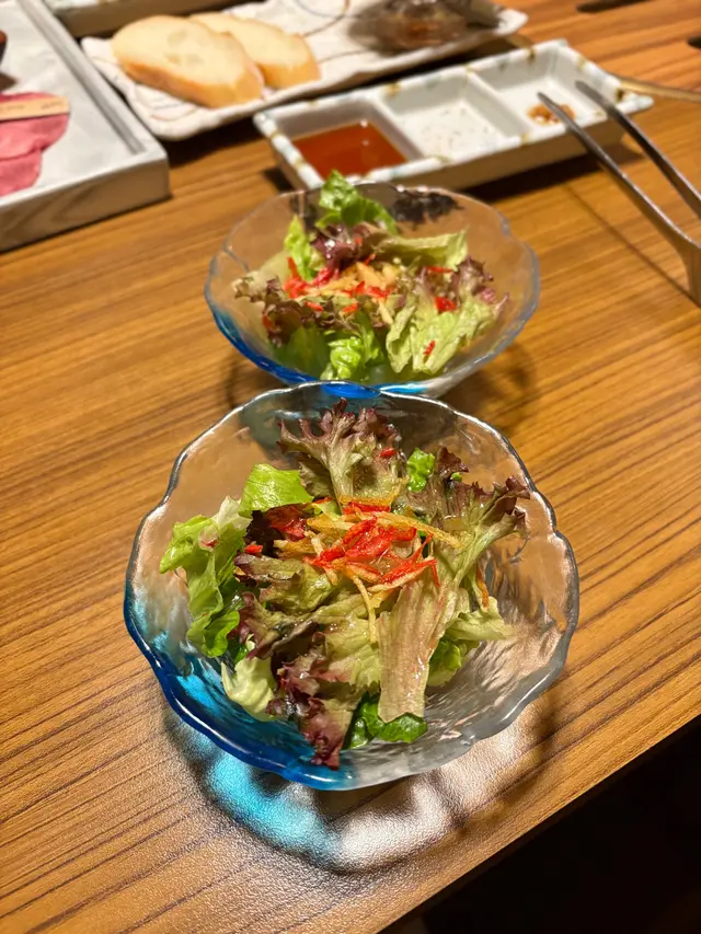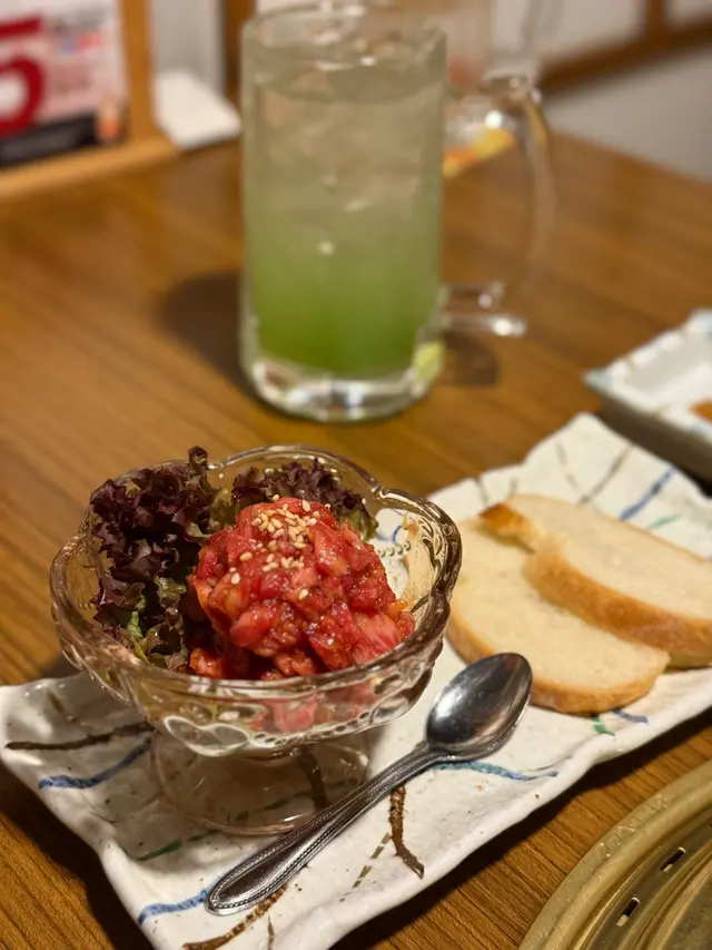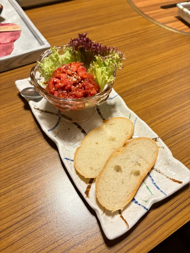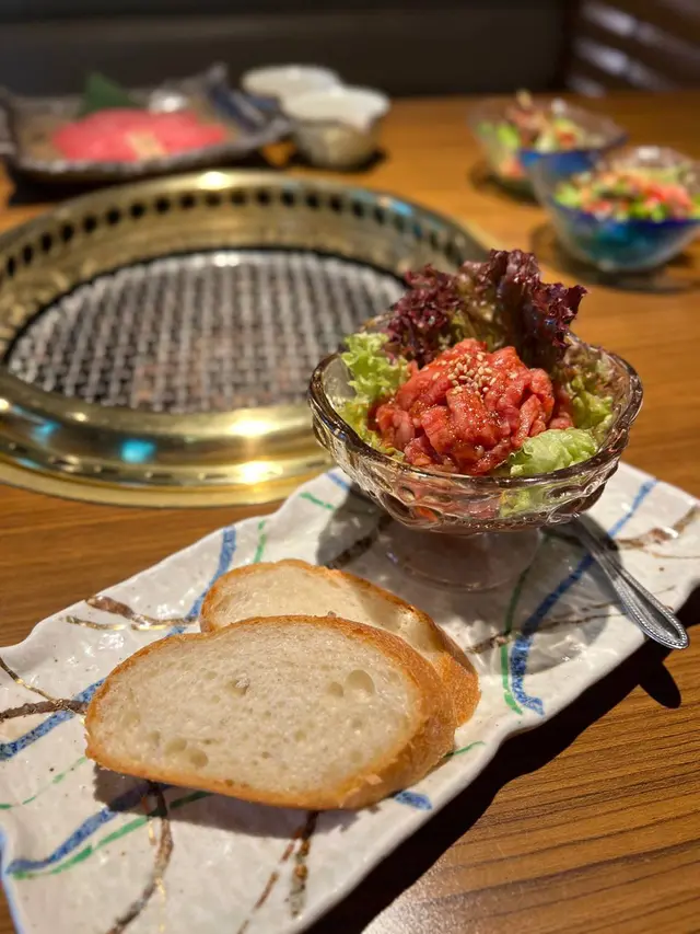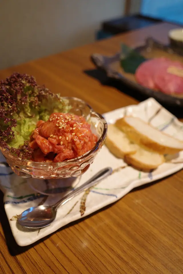 前菜有迷你沙律,新鮮翠綠的沙律菜,配上柚子醋汁及櫻花蝦,清新開胃特製宮崎和牛他他配法包