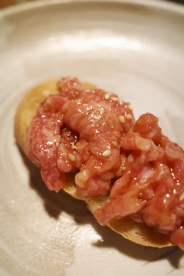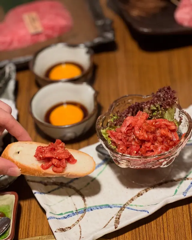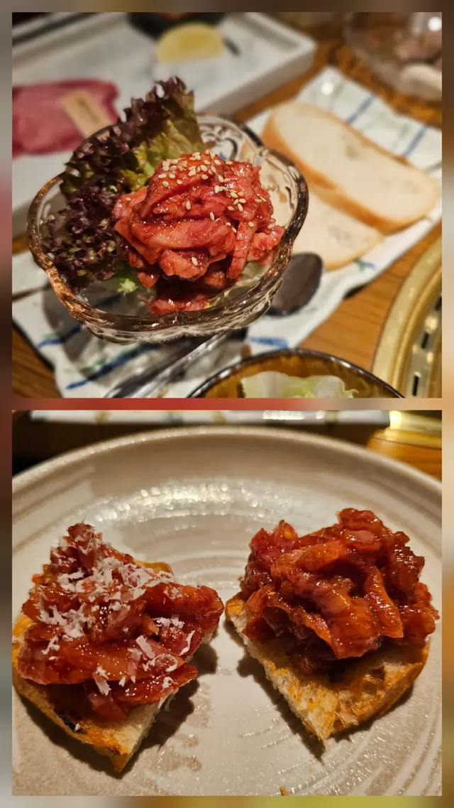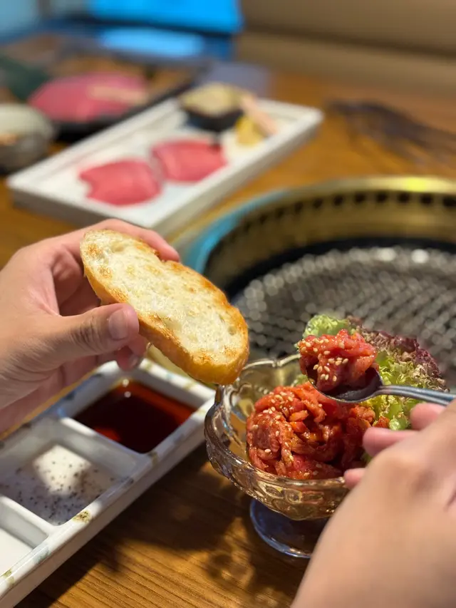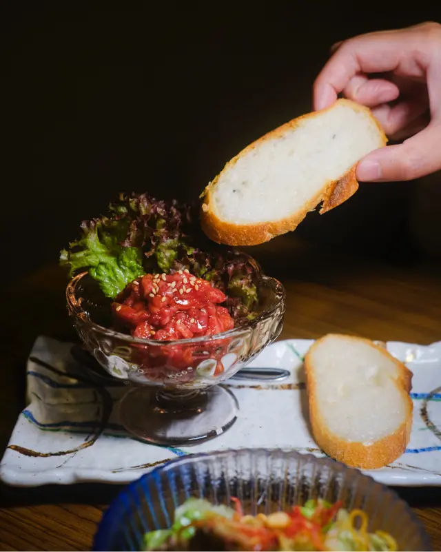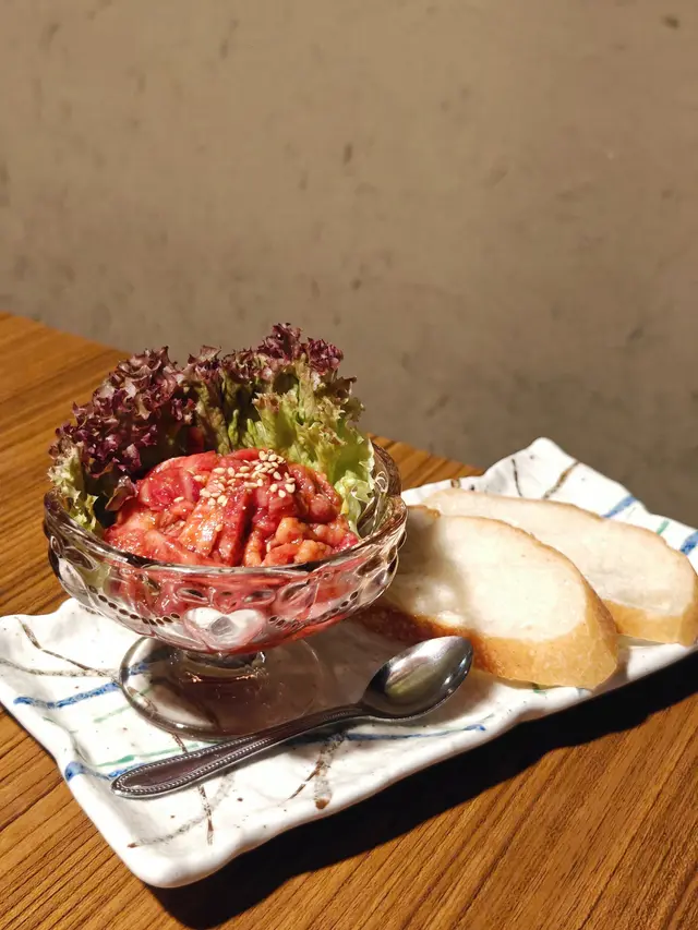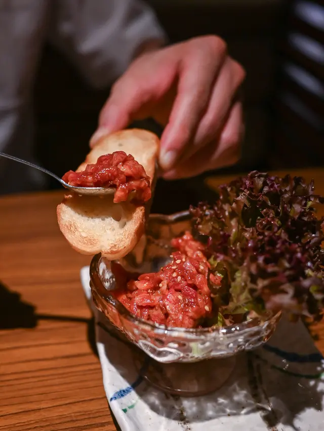 法包可以用爐火輕輕烘烤,配上口感軟滑的和牛他他,正呀韓式煎餅(海鮮)