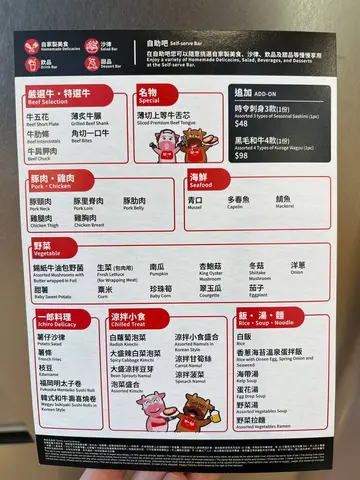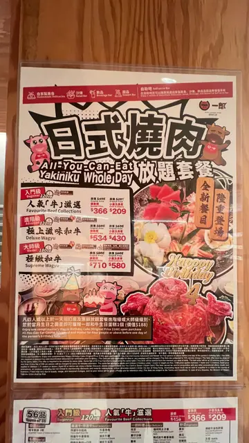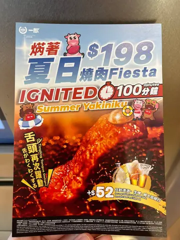 🍖【和牛放题狂热】今晚同朋友去佐敦烧肉一郎食和牛放题🇯🇵!一个价钱就可以任点黑毛和牛7大部位,仲有刺身、海鲜无限追加,简直系肉食兽天堂。今次专攻佢哋嘅黑毛和牛系列,每款试匀唔同腌料,不同的体验🥩 黑毛和牛肋肉四重奏🔥 盐味酱牛肋肉:简单盐烧最能食到和牛原味,油脂甘香入口即化,洒少许柠檬汁更清爽!🔥 原味牛肋肉:雪花纹理好靓,轻烤15秒粉红色泽完美,肉汁在口腔爆发!🔥 烧肉酱牛肋肉:日式甜酱油腌制,咸甜交织超送饭~烤到微焦边最正!🔥 辣味噌酱牛肋肉:惊喜推荐!味噌辣劲慢慢渗出,惹味得嚟唔会盖过牛香🌶️🎯 薄切里脊+角切一口牛▪️ 薄切里脊(烧肉酱/辣味噌),超薄切片快熟唔韧,推荐卷住葱花一齐食。▪️ 角切一口牛(原味/盐味酱),骰子大小啖啖肉,外焦内嫩锁住肉汁,原味蘸wasabi更有惊喜!🐟 生牛肉刺身三重奏估唔到有咁多和牛剌身可以食到。 生牛肉刺身冰镇上枱保持鲜度,肉质软滑似吞拿鱼腩。生牛肉寿司用醋饭平衡牛肉油脂,入口即化无筋络! 生牛拖罗刺身系奢侈享受!油花分布均匀,甘香余韵长留。生牛大腹肉寿司的腹肉油润丰腴,寿司饭吸收肉汁超满足。🦐 海鲜烧烤精选大虎虾手掌长size!烤到虾壳焦脆,肉质弹牙鲜甜。 海虾细只但鲜味浓,适合放烤炉边慢慢烘。青口牛油蒜蓉烧最夹,海水咸香突出。锡纸蒜蓉牛油烧虾系懒人恩物,锡纸锁住虾鲜,蒜蓉牛油香气逼人。🍦自助区 自助区有好多熟食、凉拌仲有多款前菜、炸物、甜品。饮品有自家制有冻有热嘅茶饮、玻璃樽装可乐、雪碧同芬达😍…查看更多