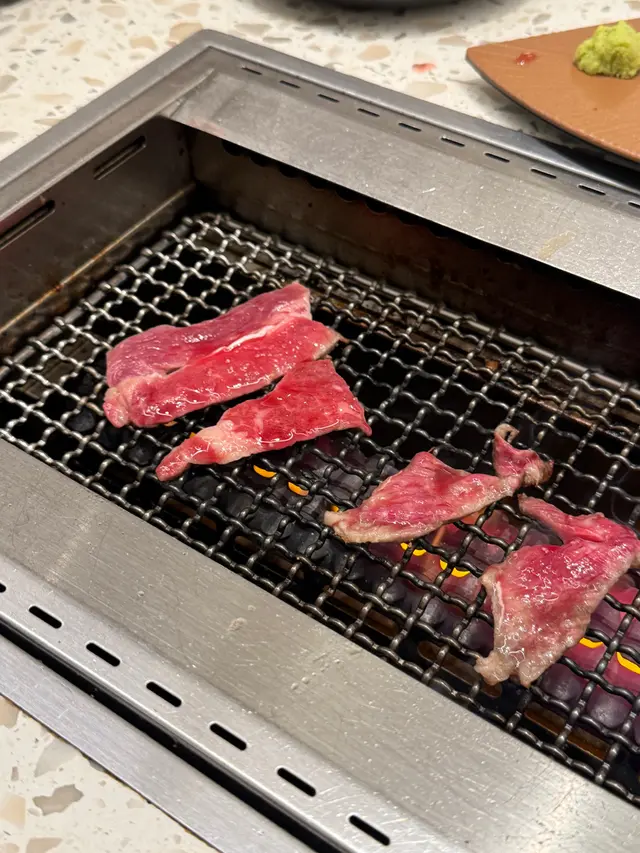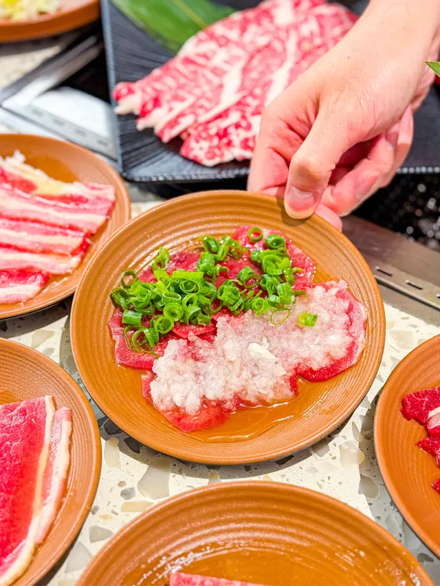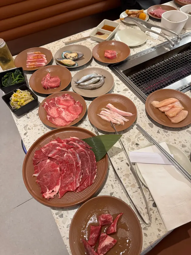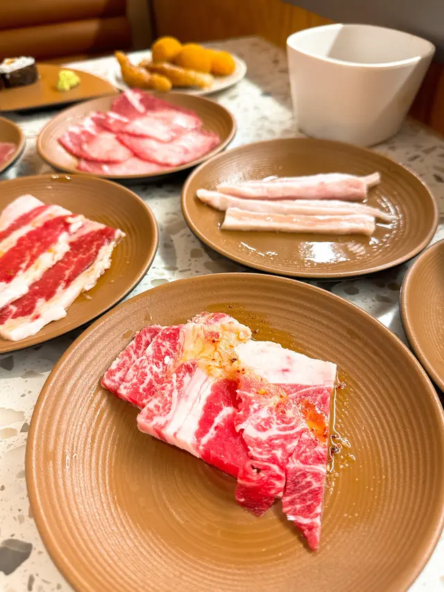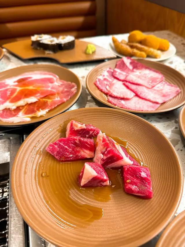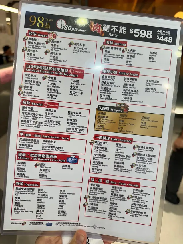 餐廳主打燒肉放題,裝修整潔光亮,座位寬敞舒適,門前放置大大隻牛公仔,非常有特式。這裏是用明火燒烤,抽氣做得不錯,完全沒有油煙味。我們選了「肉禽故縱」燒肉套餐。掃碼點菜,任點任食。餐廳嚴選優質和牛,特設“和牛識別番號”,顧客可以掃描登入認證。燒烤方面:有牛、豬、雞、魚、蝦、海鮮、野菜等多項選擇。燒肉已經醃好,燒起來特別惹味,還有原味、鹽味醬、燒肉醬、味噌醬等不同醃料選項。其中「薄薄炙西冷」、「薄炙牛肩胛肉」、「牛板腱」都值得稱讚,透過專業的切肉法,保留鮮味之餘,能夠平衡肉質感,做到質感/脂肪/肉味比例恰當,口感非常好。除和牛外,其他如「雞腿肉」等,肉質鮮嫩可口,也不遜色。熟食方面:有天婦羅、壽司、燒牛舌、湯、飯麵等,選項非常豐富。其中的「天婦羅龍脷柳」、「天婦羅珍珠筍」,炸得酥脆香口,龍脷柳鮮嫩滑溜,珍珠筍青翠爽口,是不能錯過選項。「酢味噌燒牛舌」,鮮味牛舌,燒得香口,口感爽嫩,點上酢味噌醬,味道更上一層樓。自助吧:多款罐裝及樽裝飲品、醬料、炸蝦、炸雞、味付螺肉、八爪魚、肉燥飯、田園沙律、布甸、提拉米蘇、雪糕、自家製花茶等。其中「炸蝦」、「提拉米蘇」、「木糠布甸」特別出色。由於上菜效率高,用餐時間120分鐘,卓卓有餘,可以吃得非常滿足。…查看更多